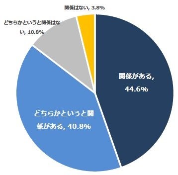 オーガニックコットンのパジャマを着用した経験が「ある」と回答した方130名を対象に、オーガニックコットンパジャマと睡眠の質に関係があると思うか質問したところ、85.4%が「関係がある」(関係がある:44.6%、どちらかというと関係がある:40.8%)と回答しました。