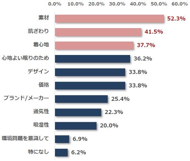 オーガニックコットンのパジャマを着用した経験が「ある」と回答した方130名を対象に、オーガニックコットンパジャマを購入した理由について質問したところ、最多回答は「素材(52.3%)」、次に「肌ざわり(41.5%)」、「着心地(37.7%)」と続きました。