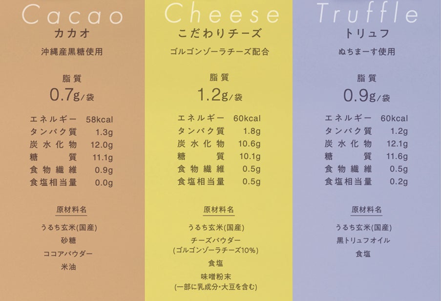 ・脂質を抑えた設計 (カカオ:0.7g/袋、チーズ: 脂質1.2g/袋、トリュフ:脂質:0.9g/袋)