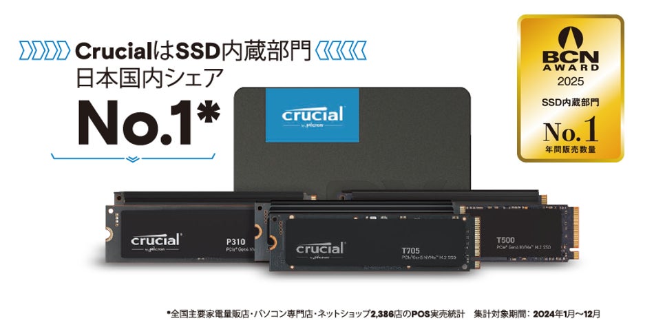 この度、Micron Technologyのグローバルコンシューマーブランドである Crucial(クルーシャル)が「BCNアワード2025」においてSSD部門で受賞しましたことをお知らせいたします。BCN AWARDは、全国の主要家電量販店やECサイトの実売データを基に、年間を通じて最も支持された製品やブランドを表彰するものです。