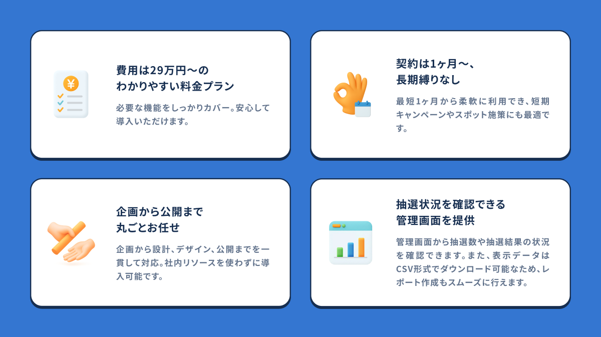 YONDEでは、こうした課題を解消するため、企画・制作・公開に加え、キャンペーンの進捗状況を確認できる管理画面の設定までをワンストップで対応する「オンラインガチャ制作サービス」を提供します。契約は1ヶ月から、費用は29万円から利用できるため、単発のキャンペーンでも導入しやすく、スムーズなキャンペーン実施を実現します。
