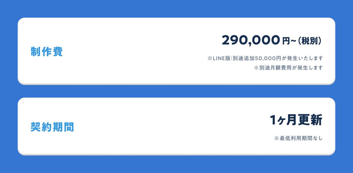 290,000円〜(税別)※LINE版をご利用の場合は、別途追加費用が発生いたします。