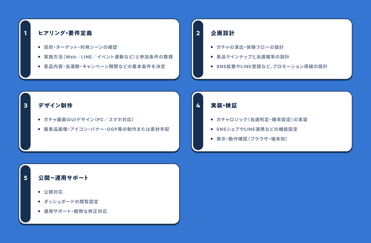 YONDEのオンラインガチャ制作サービスは、企画から制作、公開後の管理画面提供、運用サポートまでをワンストップで提供するサービスです。