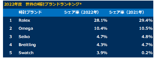 上位4ブランドについては2021年から変化はなかったものの、今年もRolexがシェア率を下げる結果となりました。また、2022年3月にOmega(オメガ)とのコラボモデル、MoonSwatch(ムーンスウォッチ)が発売されたことを受けて、2021年に10位圏外だったSwatchが第5位という結果に。シェア率を0.2%から3.9%に伸ばしました。