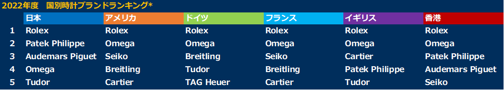 国別に見ていくと、日本以外の国では第2位にOmegaがランクイン。日本は、1位のRolex(ロレックス)に続き、Patek Philippe(パテック・フィリップ)、Audemars Piguet(オーデマ・ピゲ)が2位、3位。これに続いてOmegaは第4位という結果でした。香港では昨年Omegaは4位でしたが、今年は2位にまで順位を伸ばしました。昨年Swatchとのコラボモデルにより知名度を上げたことや、他のブランドと比較し価格水準を安定させることができたことが、順位を上げた理由として考えられます。