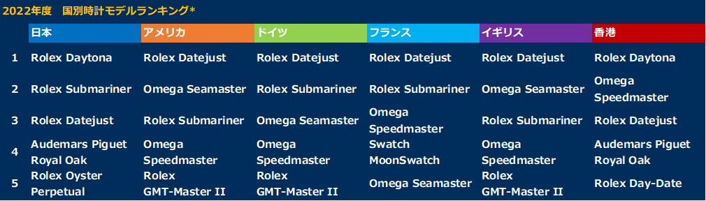 今回の国別の時計モデルのランキングの結果は、主要ブランドの需要の高さが顕著に現れる結果となりました。Rolexは2022年においても、さまざまなモデルで最も需要の高い時計ブランドです。MoonSwatchの発売は時計業界でも注目の的となり、OmegaとSwatchのこのコラボモデルに対する需要は、確実に2022年モデルランキングの結果に反映されました。