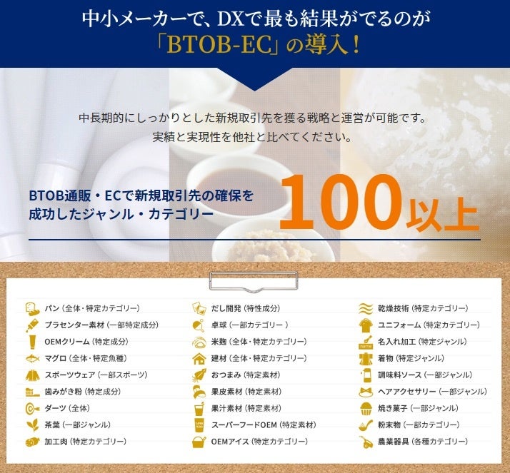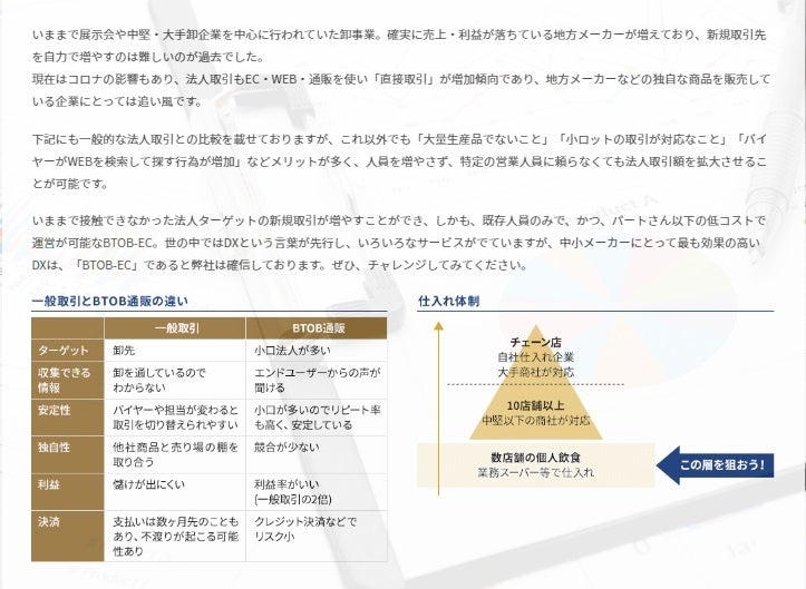 コロナが世界に影響を与えたことの1つは、EC・DXマーケットを5年以上先に進めましたことです。特にBTOB-ECのマーケットが一気に伸び、さらに、地方中小メーカーの伸びが著しいのが特徴です。BTOB-ECマーケット拡大はWEBチャネルがキーチャネルであることも中小メーカーには追い風です。すでに多くの実績が弊社でありますが、社内にプロ人材がいなくても、低コストで立ち上げ・運営ができる地方メーカー特化型のBTOB-EC運営代行・コンサルサービス拡大をすることにいたしました。