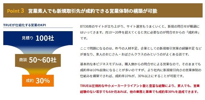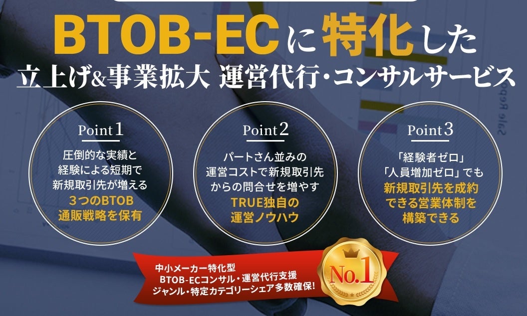 トゥルーコンサルティング株式会社(本社:東京都港区、代表取締役 萱沼真吾)は、中小企業DX応援プロジェクトの一環として、地方中小メーカー限定のBTOB-ECコンサルティング・運営代行サービスを7月27日より拡大を開始します。