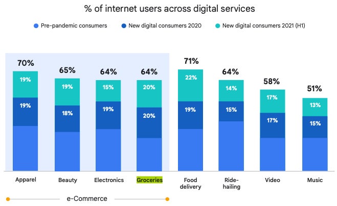 東南アジアにおいても、新型コロナウイルスのパンデミックの影響で、食料品のオンライン購入が急増。パンデミック開始後、食料品のオンライン購入を始めたインターネットユーザーの割合は約3倍に増加しました。