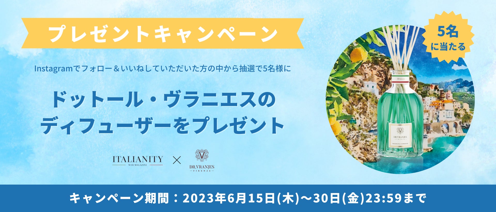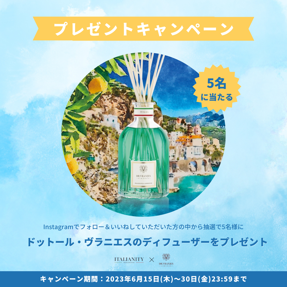 SivanS株式会社(本社:東京都港区北青山3-3-5東京建物青山ビル3F、代表:中村シバン)が運営するイタリアのライフスタイルに特化したウェブマガジン「ITALIANITY」(italianity.jp)では、ITALIANITY公式Instagramをフォロー&キャンペーン投稿にいいねしていただいたの中から、イタリア・フィレンツェ発ルームフレグランスブランド“DR. VRANJES(ドットール・ヴラニエス)”のディフューザー「ITALIA(イタリア)」が抽選で合計5名様に当たるプレゼントキャンペーンを、6月15日(木)〜30日(金)まで実施します。