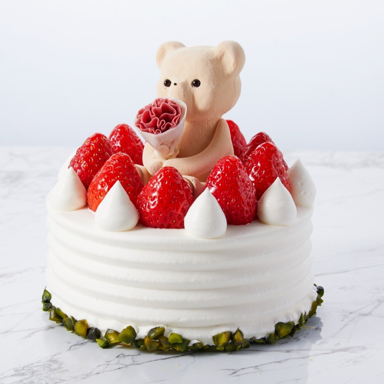 国産ブランド苺、ライチ、シャンパンロゼの3種のマリアージュを堪能できるムースケーキ。あまおうムースの中に閉じ込められた苺ソースがフレッシュな味わいを演出し、口いっぱいに広がる至福の風味をお楽しみいただけます。カーネーションの花束が目を引くこのムースケーキは、大切な人への特別な贈り物に最適です。