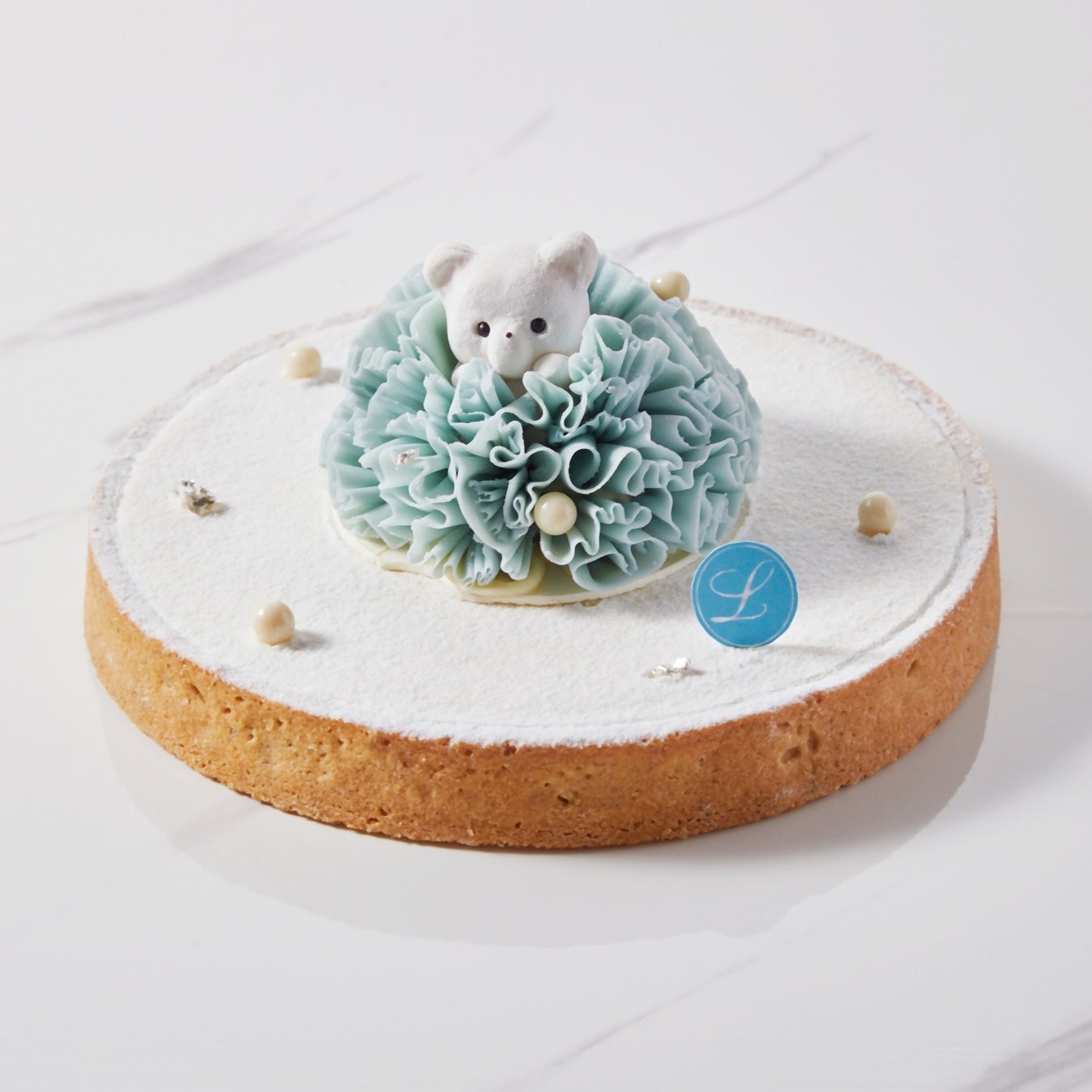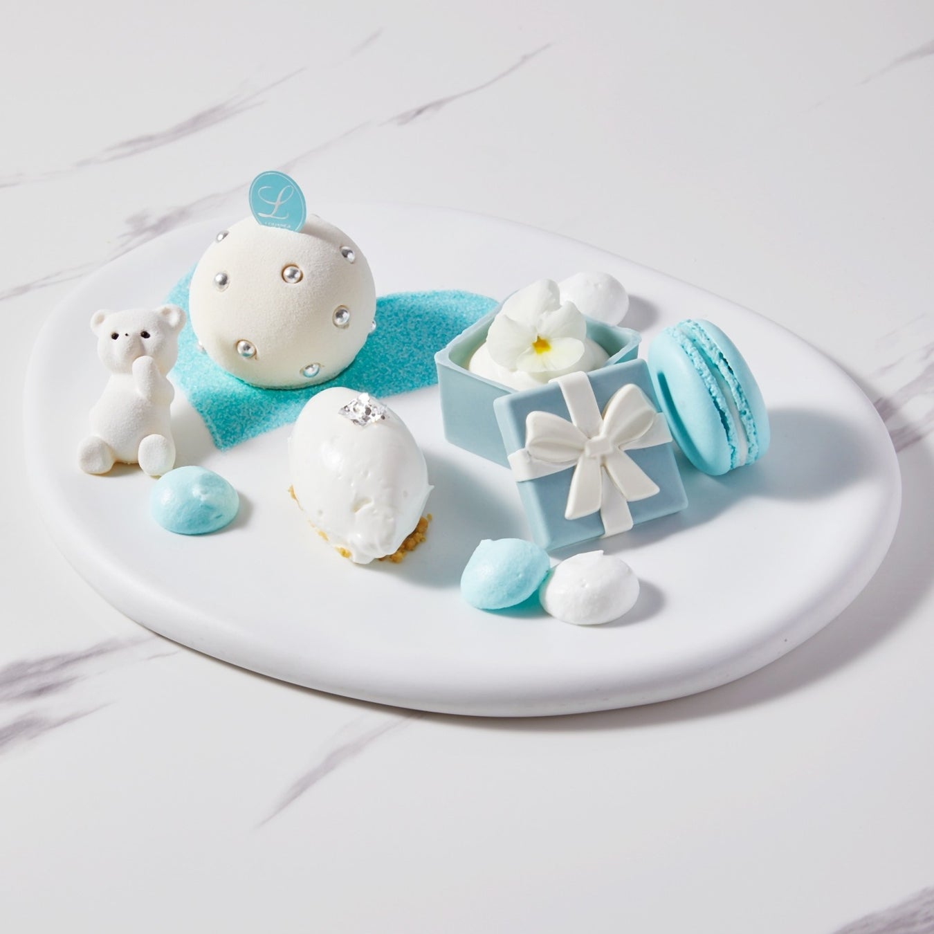 シルバーのパールが映える真っ白なスフェールは、ホワイトチョコのムースにラズベリーのジュレやピスタチオブリュレをあわせました。ブルーのマカロンと、チョコレートのブルーボックス、真っ白なソルベをそえた上品な逸品。愛らしい純白のテディベア“ヌーミー”が、大切な人への感謝の気持ちをお届けします。