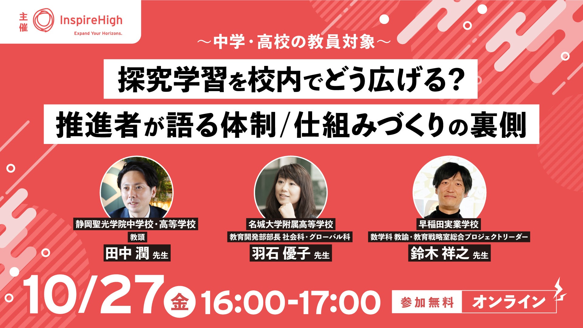 今回、試行錯誤を重ねながら校内で探究的な学びを広げてきた先生方をお招きし、体制づくりや仕組み化、カリキュラム設計などについてお話いただきます。各学校の実践事例から、ヒントをお持ち帰りいただく場となりますので、ぜひご参加ください。