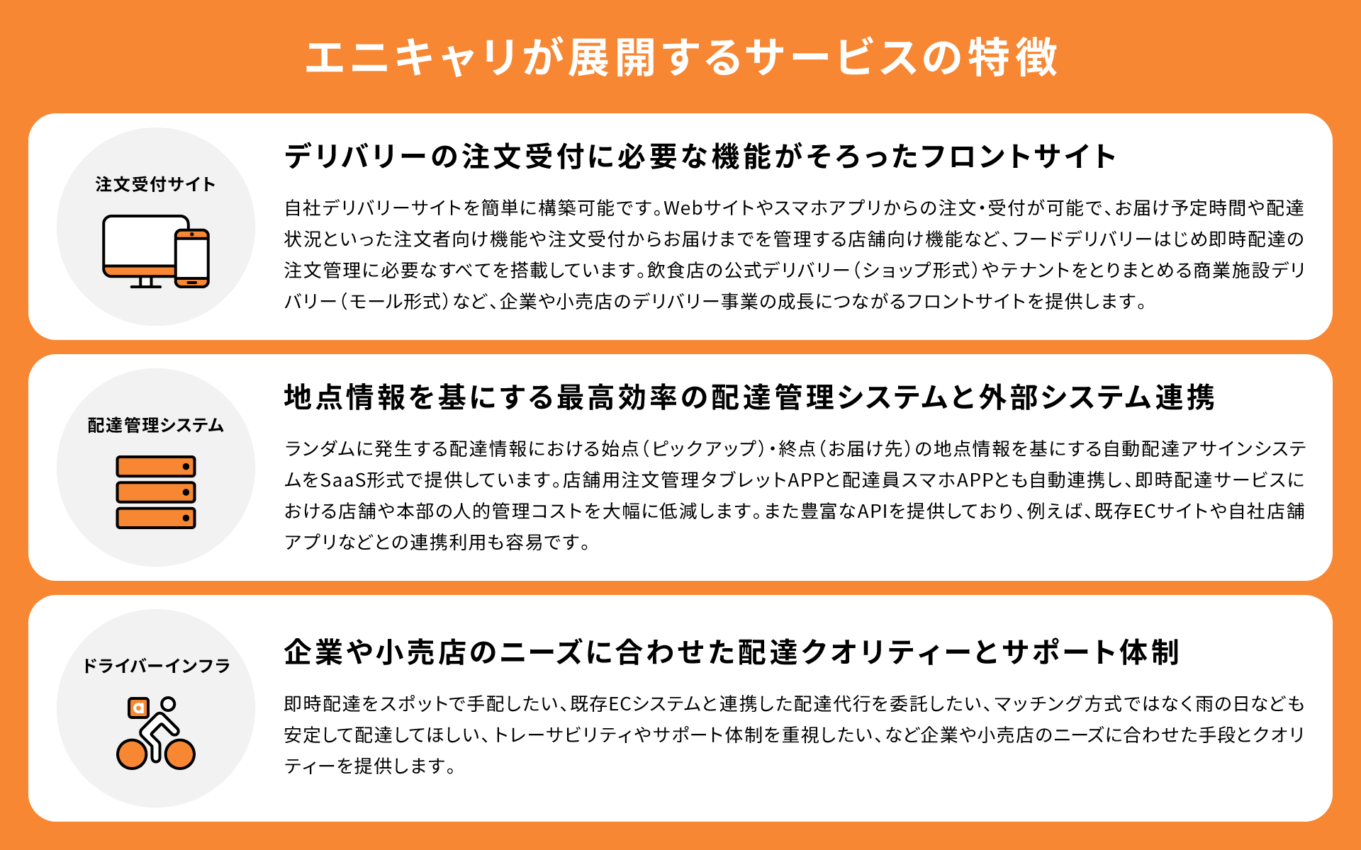 即時配達をスポットで手配したい、既存ECシステムと連携した配達代行を委託したい、マッチング方式ではなく雨の日なども安定して配達してほしい、トレーサビリティやサポート体制を重視したい、など企業や小売店のニーズに合わせた手段とクオリティーを提供します。