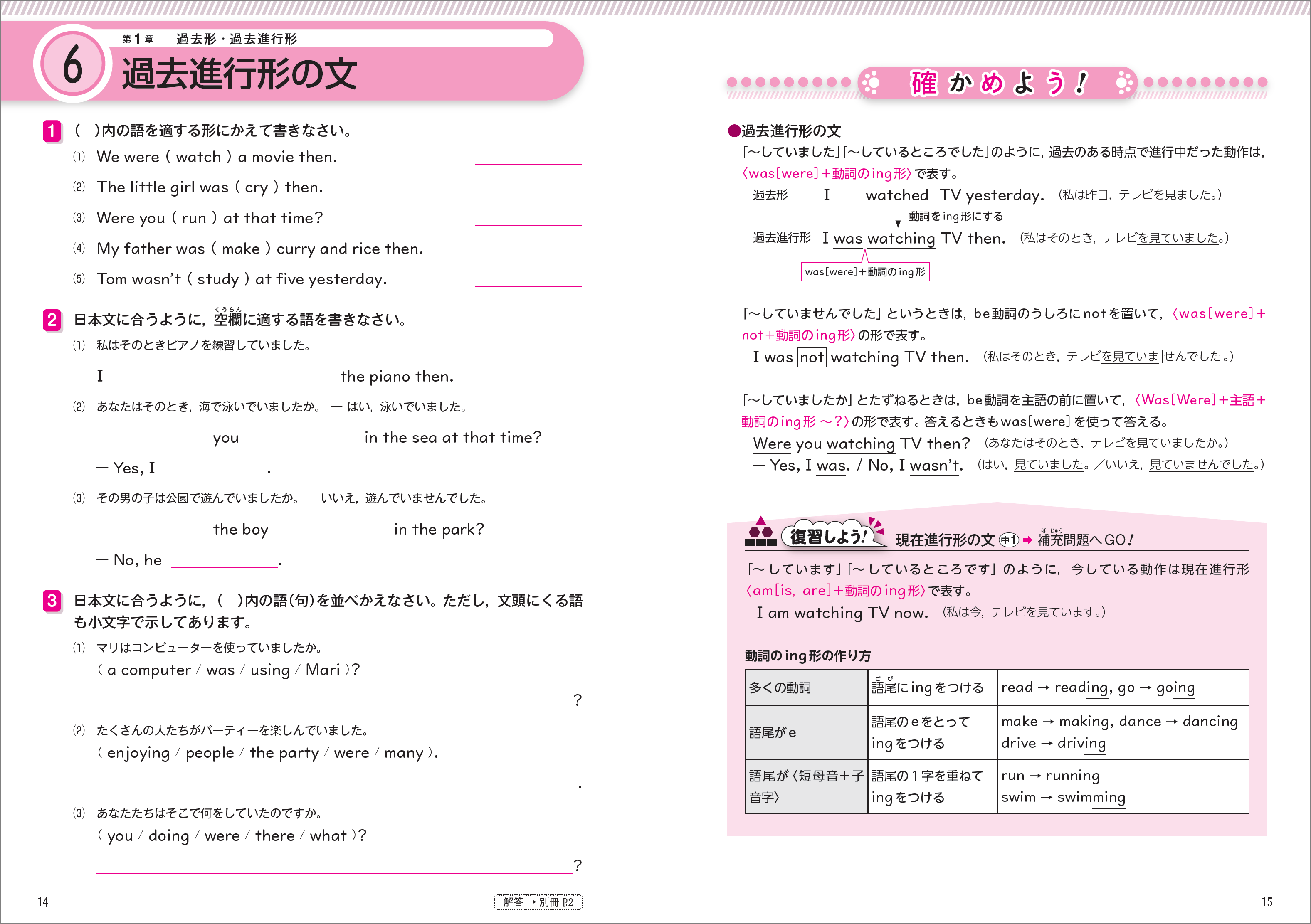 ↑ 数学、英語の紙面。左ページが問題、右ページの「確かめよう!」が要点まとめです。「復習しよう!」には既習事項をまとめており、弊社HPからダウンロードできる補充問題プリントもついています。
