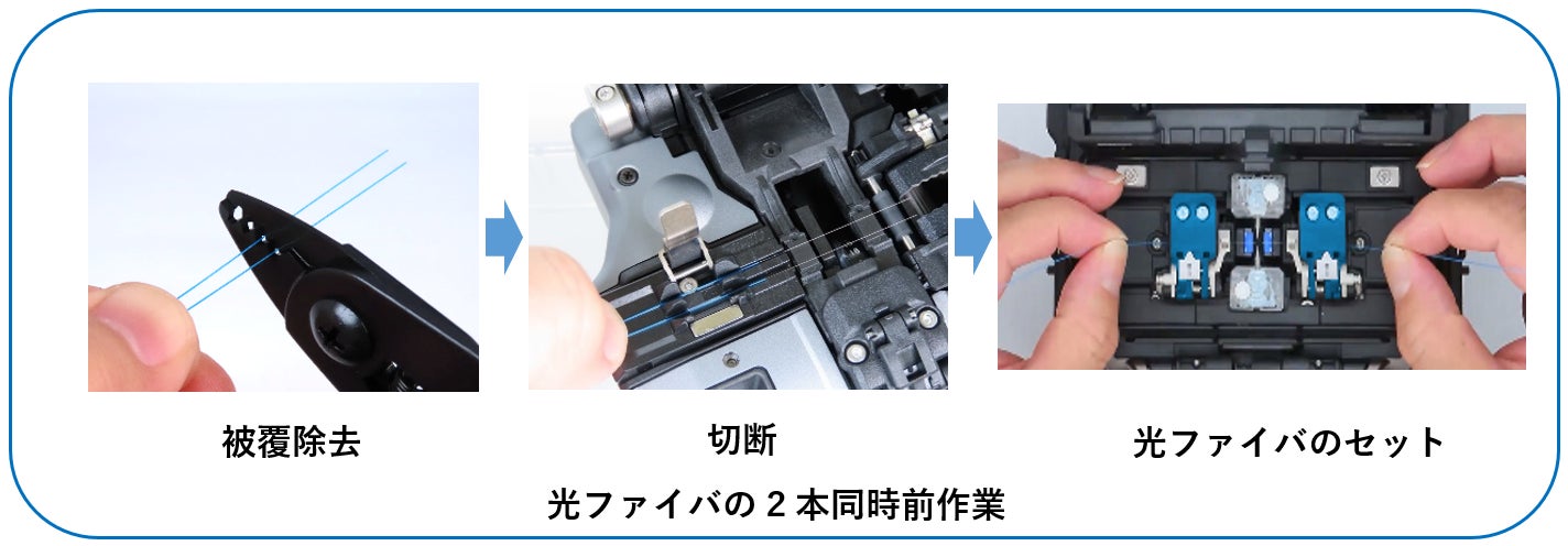 光ファイバを融着接続するには、事前に光ファイバの「被覆除去」、「切断」、「融着接続機へのセット」という作業が必要で、従来、2本の光ファイバを融着するには、それぞれの作業を1本ずつ行う必要がありました。