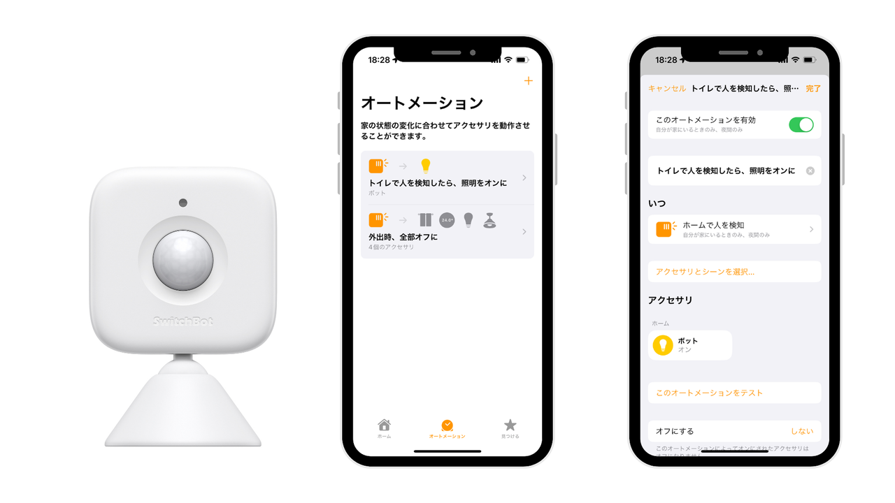 ホームアプリから人感センサー+ボットを使って、例えばトイレに入ると自動的に電気が点き、トイレに人がいない時は自動で消灯するようにできます。同じやり方で、リビングに空き巣などが侵入してきたら、自動で電気が点いてHomepod miniでアラームが鳴るように設定し、防犯対策としてお使いいただけます。