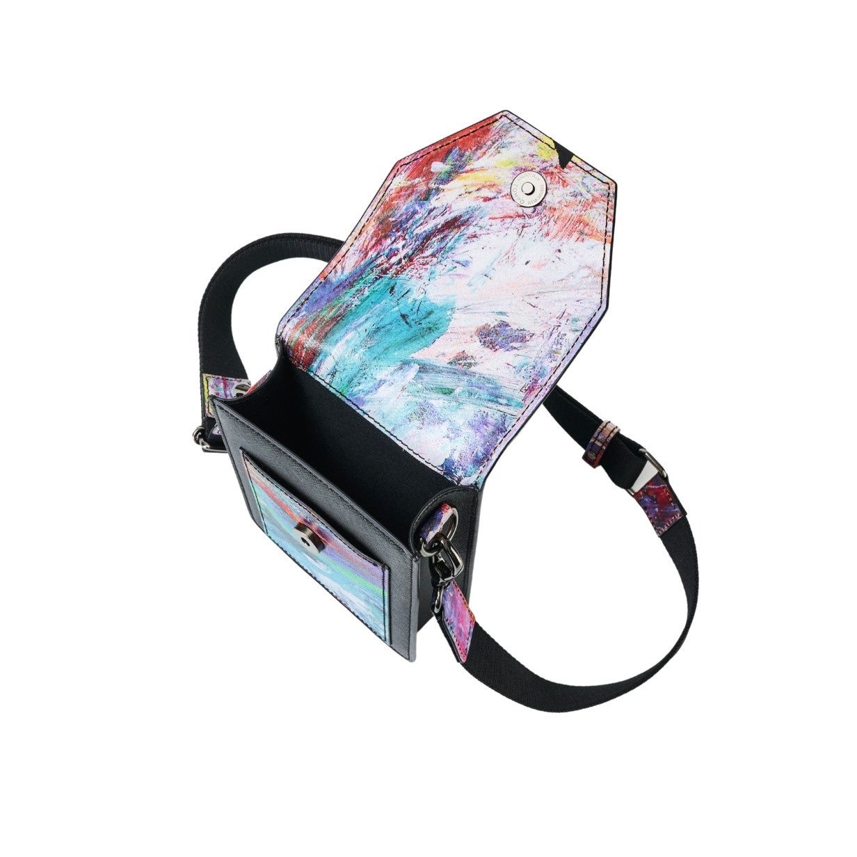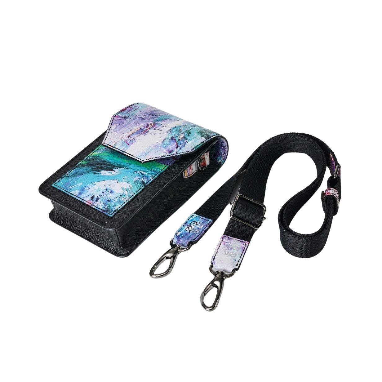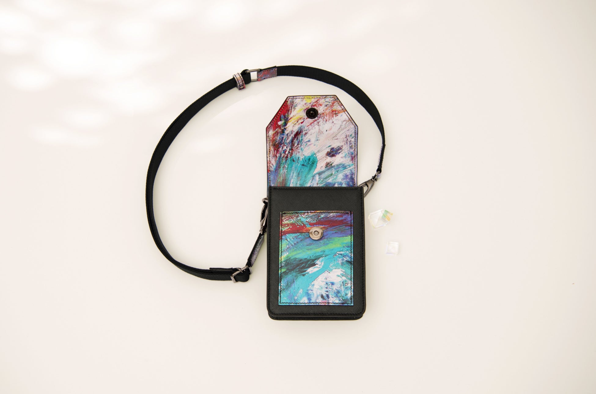 カジュアルなリラックススタイルにはもちろん、シャツやジャケット姿に合わせてもサマになるのが嬉しい縦型ショルダーバッグ。レインボーカラーで描かれた抽象柄に、シックな黒のマッシュルームレザーのコンビが、遊びすぎず大人すぎない絶妙なバランス。縦長の四角いフォルムは、品格ある雰囲気もキープ。加えて、スマホや財布といった必需品がちょうど収まるサイズ感もデイリー使いに最適なアイテム。