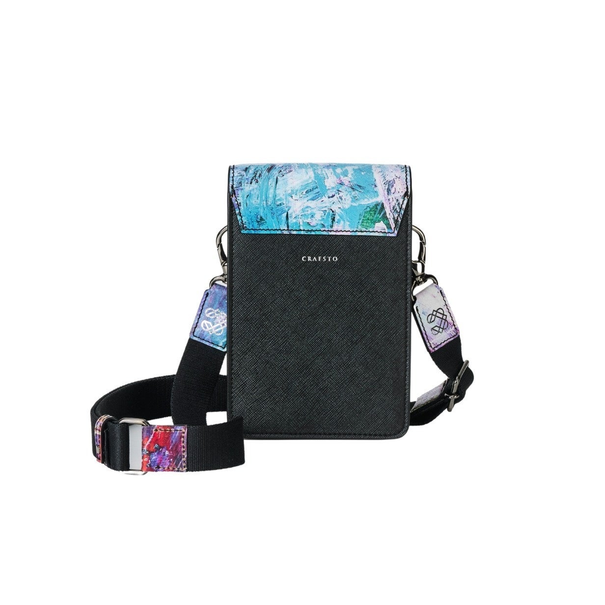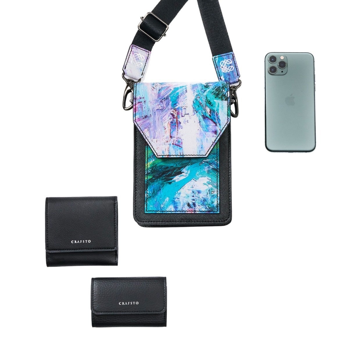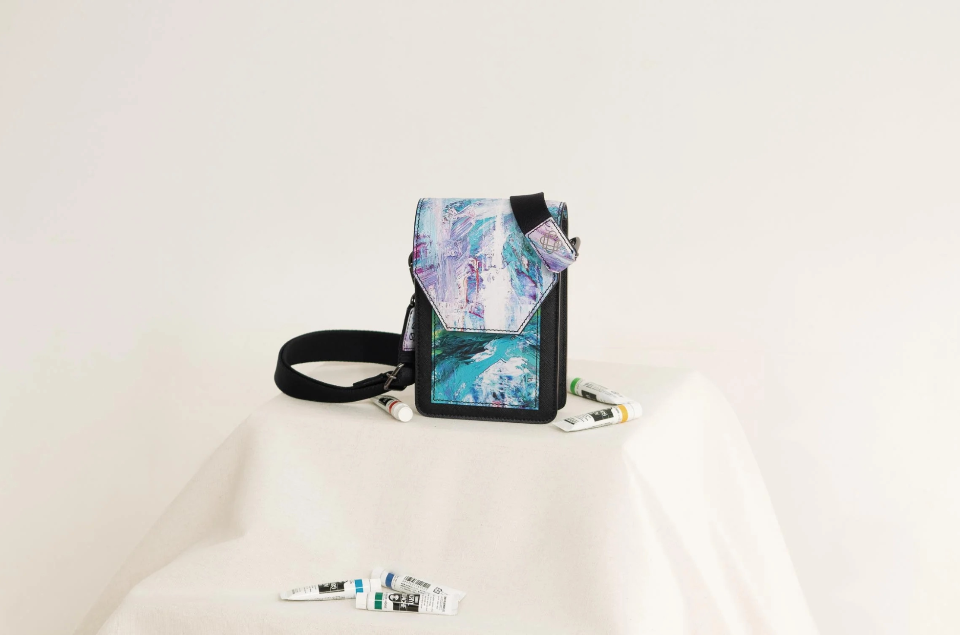 カジュアルなリラックススタイルにはもちろん、シャツやジャケット姿に合わせてもサマになるのが嬉しい縦型ショルダーバッグ。レインボーカラーで描かれた抽象柄に、シックな黒のマッシュルームレザーのコンビが、遊びすぎず大人すぎない絶妙なバランス。縦長の四角いフォルムは、品格ある雰囲気もキープ。加えて、スマホや財布といった必需品がちょうど収まるサイズ感もデイリー使いに最適なアイテム。