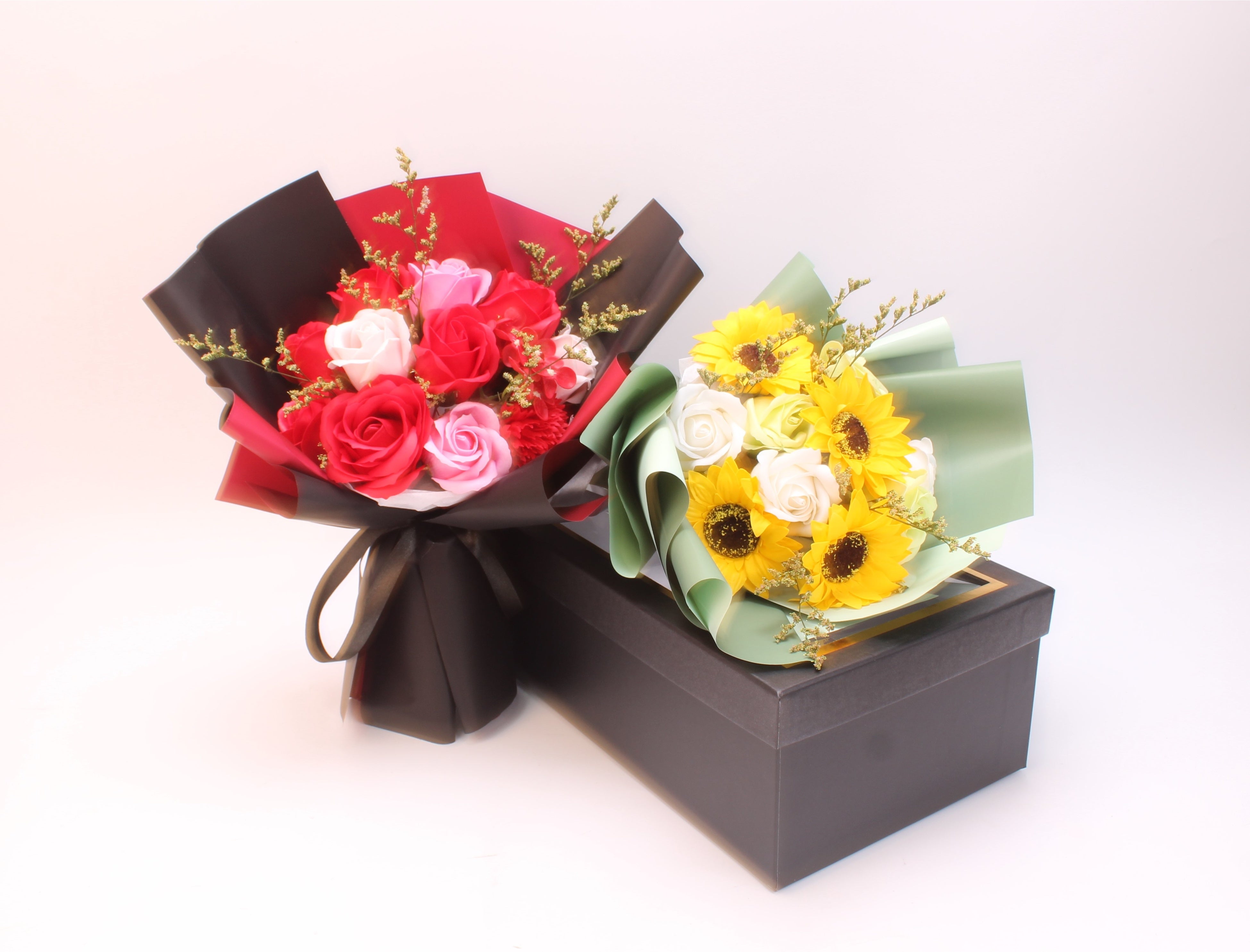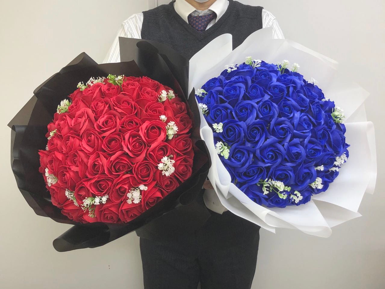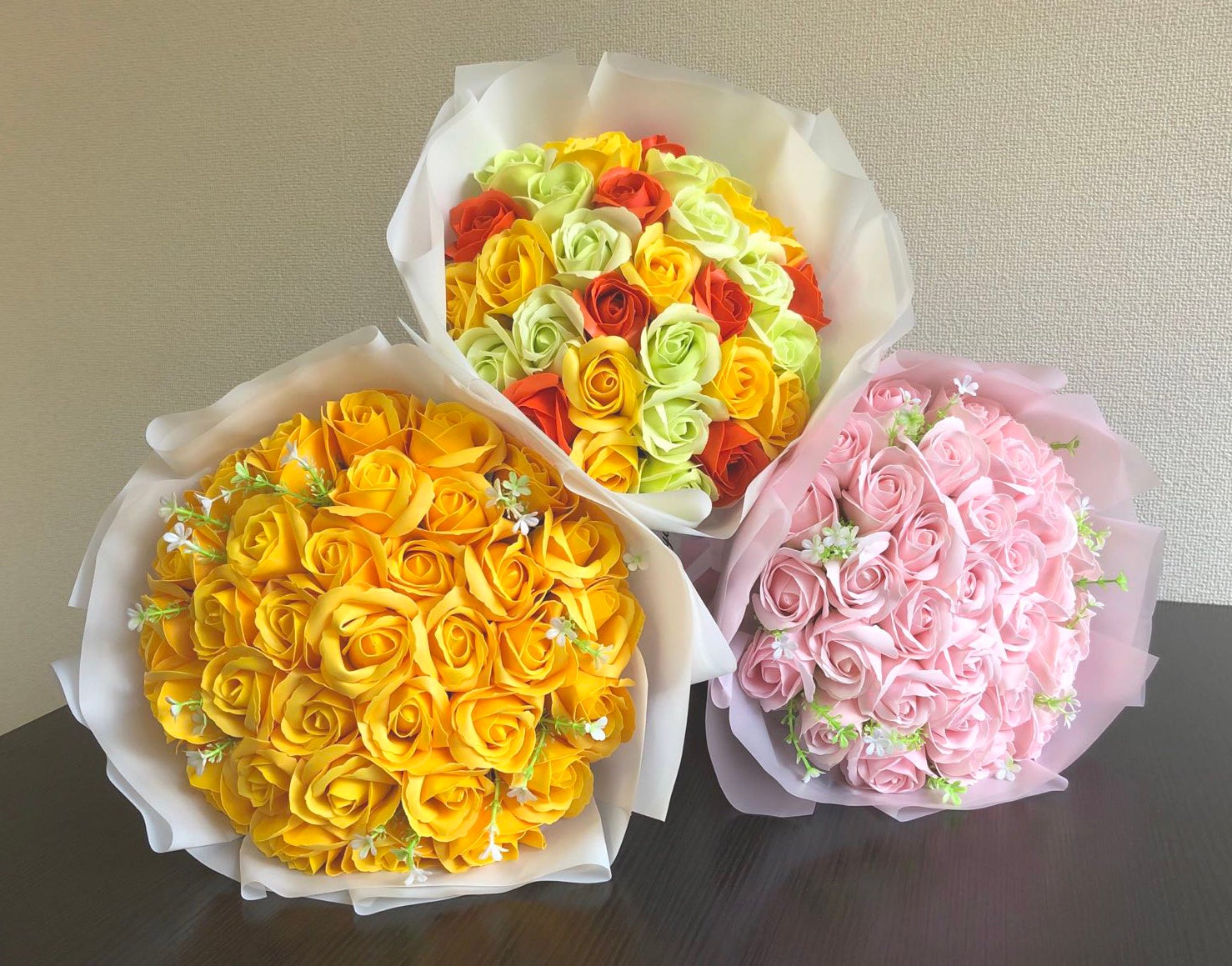 目で見て楽しめるのはもちろんのこと、ほのかなせっけんの香りに癒されるというお声を多くいただいており、世代を問わず喜ばれるソープフラワー。甘いものが少し苦手という方へのバレンタインやホワイトデーの贈り物にも当店のソープフラワーを是非おすすめします。