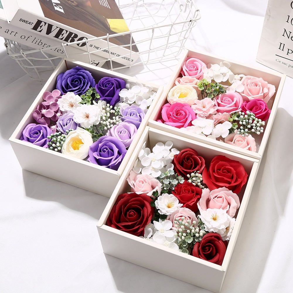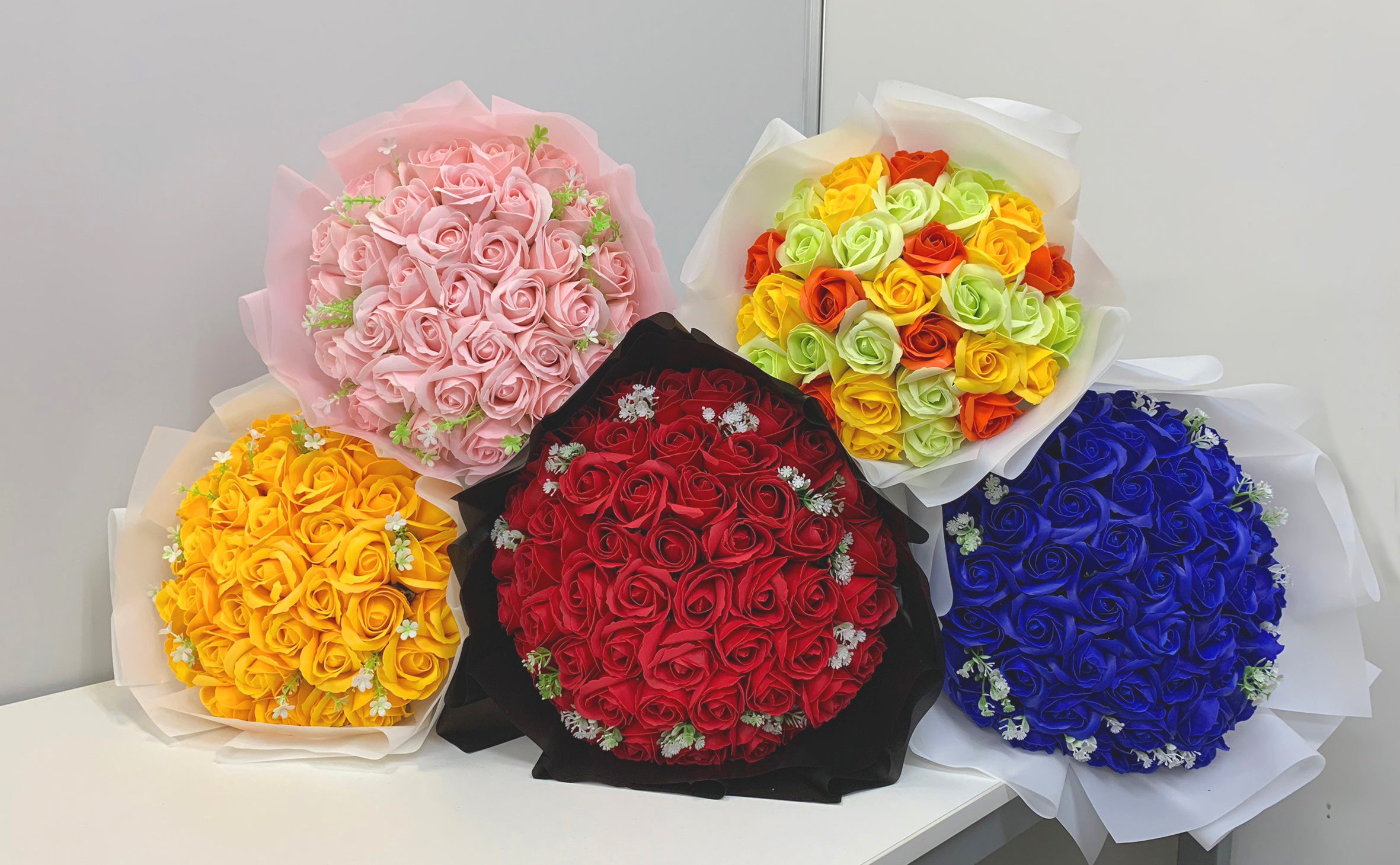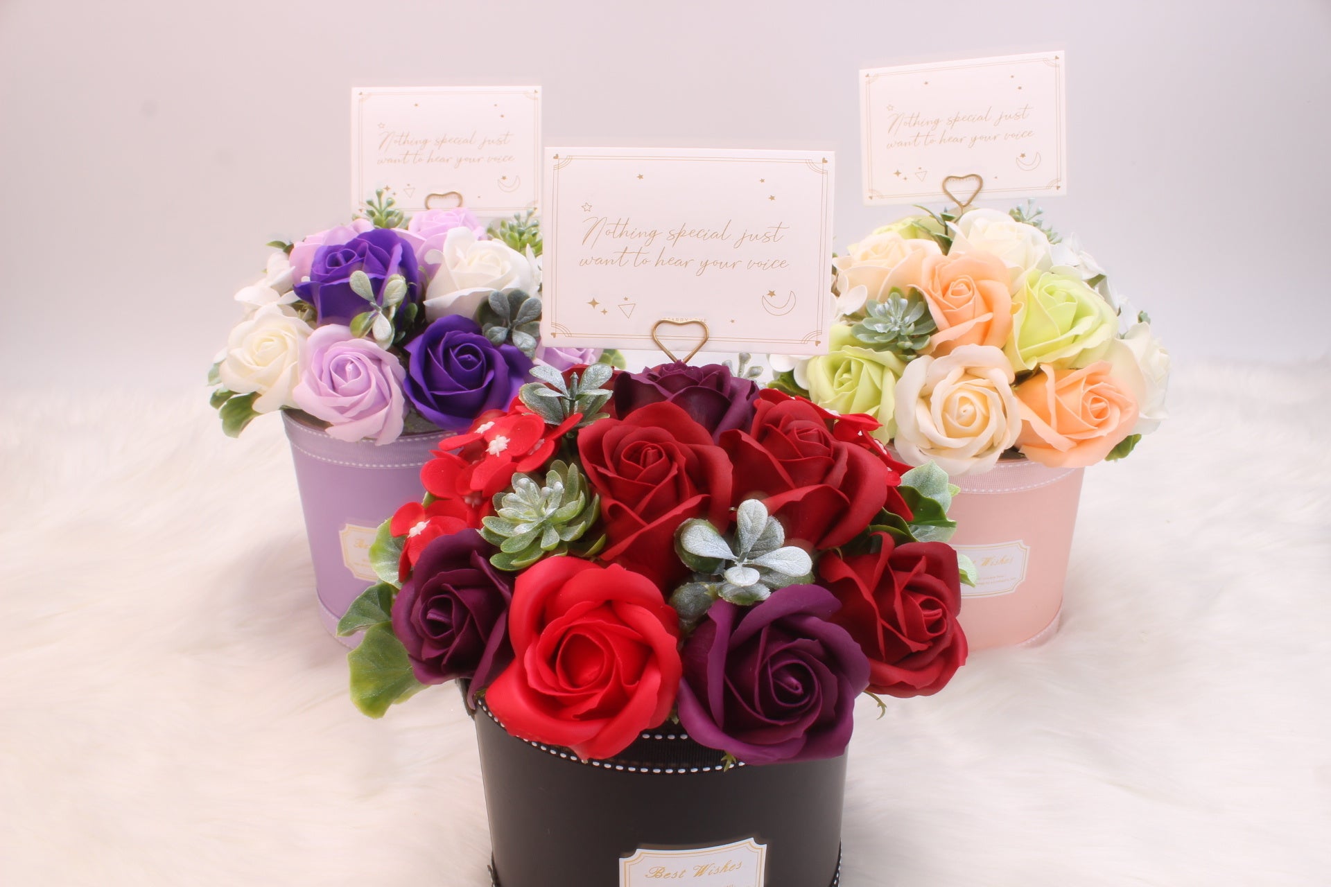 目で見て楽しめるのはもちろんのこと、ほのかなせっけんの香りに癒されるというお声を多くいただいており、世代を問わず喜ばれるソープフラワー。甘いものが少し苦手という方へのバレンタインやホワイトデーの贈り物にも当店のソープフラワーを是非おすすめします。
