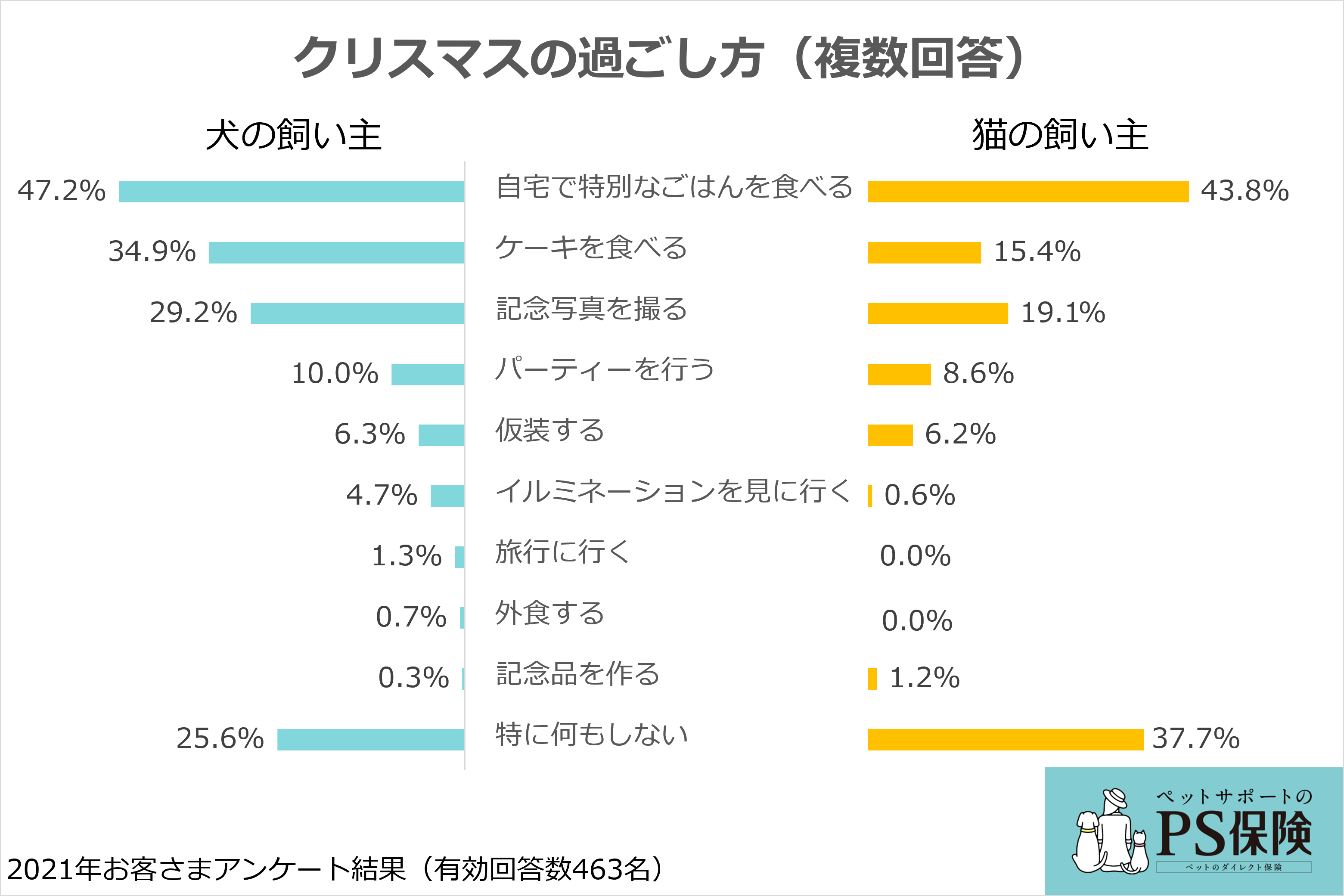 ペット保険の「PS保険」を提供する少額短期保険会社のペットメディカルサポート株式会社(本社:東京都港区赤坂、代表取締役社長:米満 明仁、以下『ペットメディカルサポート』)は、当社ペット保険「PS保険」のご契約者さま3,534名(有効回答数463名)を対象に、ペットと過ごすクリスマスについてアンケート調査を行いました。