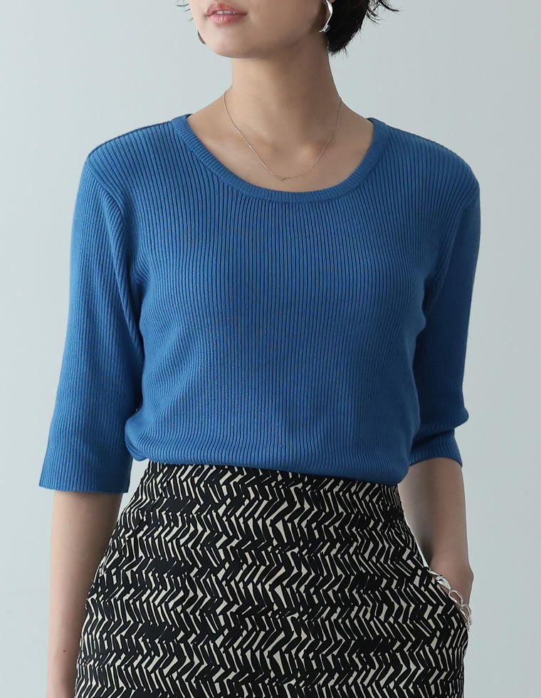 コンパクトなシルエットが洗練された印象のリブニットトップス。程よく体にフィットするデザインで、美しいボディラインを演出してくれます。二の腕が隠れる半袖は、体型カバー効果もあり、大人女性に人気の秘訣。シンプルなボトムス合わせもスタイリッシュにコーディネートが完成する1枚です。