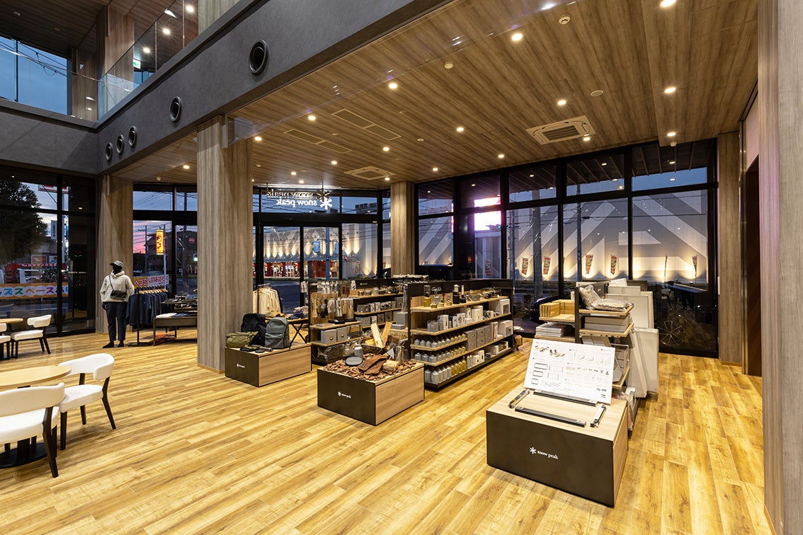ショールームが複層階となる店舗の特徴を活かし、スノーピークのキャンプ用品などを取り扱う専門スペースを2つのゾーンに分けて展開。オリジナル什器を中心とした新築とは異なる条件での開業は、ショップ イン ショップの特徴を上手く活用した、既存のお客様にも受け入れられながら、新たなお客様との接点が期待できるカタチだと考えます。
