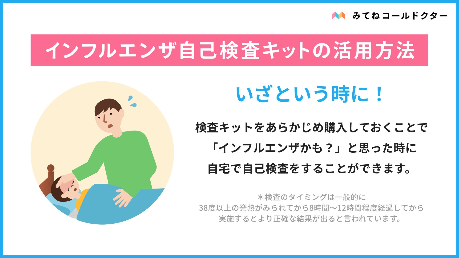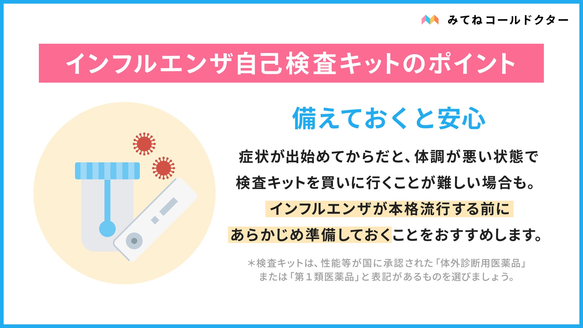 検査キットをあらかじめ購入しておくことで、「インフルエンザかも?」と思った時に、自宅で自己検査をすることができます。