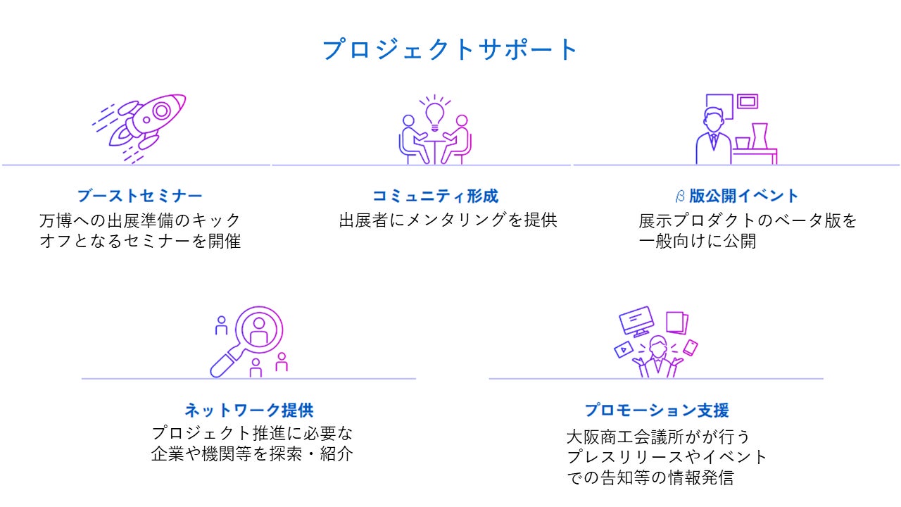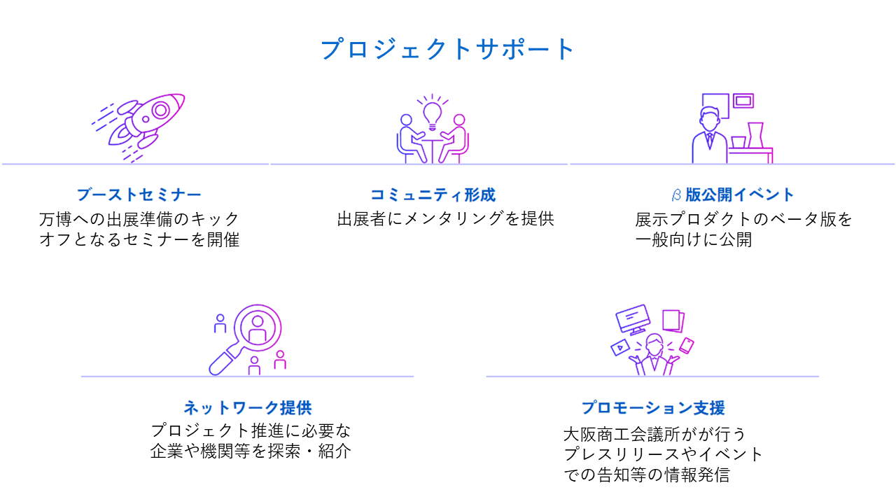 出展者のメンタリングや展示出展に向けた調整、出展準備のキックオフとなるセミナーや展示プロダクトのベータ版を公開する「β版博」の開催等を予定しています。