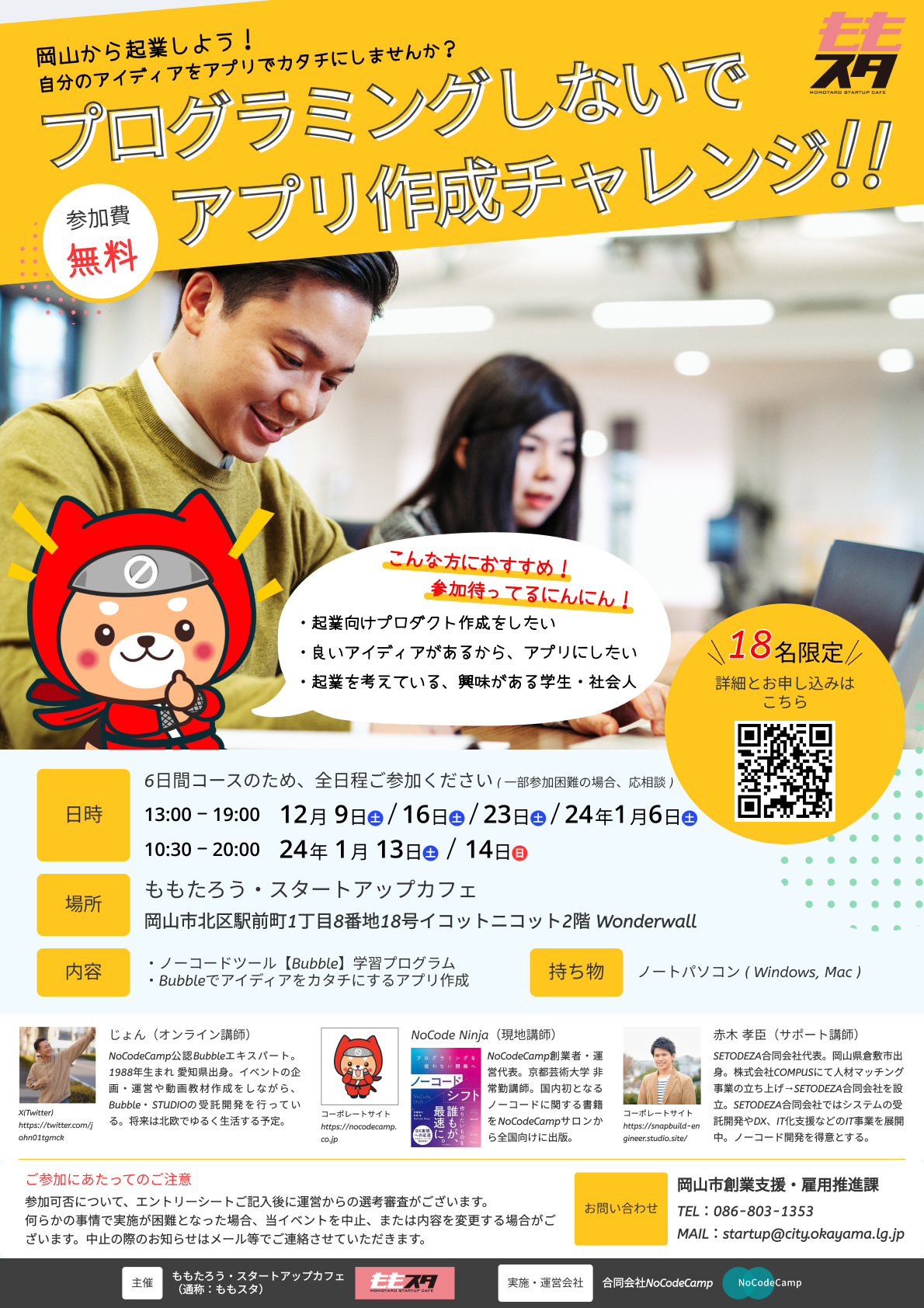 ▼ 「プログラミングしないで、アプリ作成チャレンジ(18名限定、参加無料)」概要ページ:https://momosta-nocodecamp-winter.peatix.com/