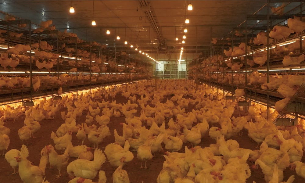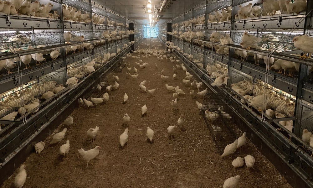 そうした中で出てきたのがエイビアリーという方式です。エイビアリーは「多段平飼い」と訳されるように、3・4階建てのマンションのように床が多層になっていて、鶏が地面を歩き回ったり、上下に自由に垂直移動できます。平屋の平飼い方式に比べて飼育できる羽数も多いし、鶏は夜になると外敵から逃れようと高い所へ行く習性がありますが、そういう行動欲求も満たしてくれる。これまで平飼いの設備をいろいろ見てきましたが、これが最終形に近いんじゃないかと思って導入することに決めました。