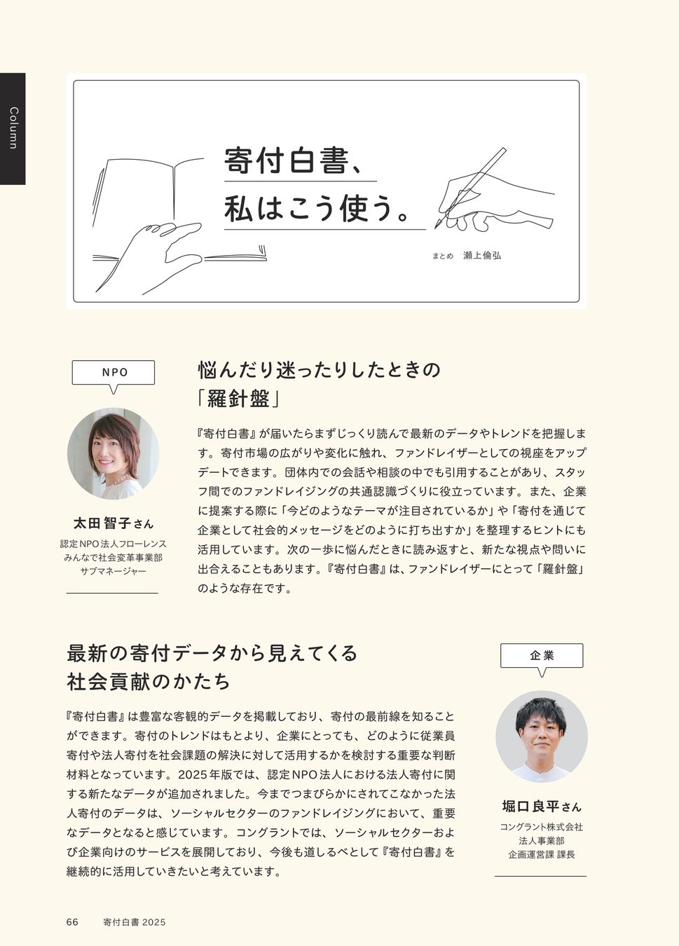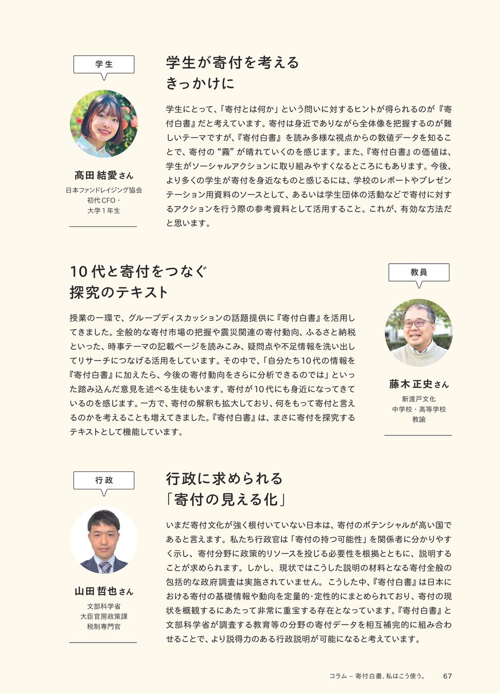 本白書P.66-67には、様々な立場の方から、この寄付白書をどう活用するかについての意見を寄せていただきました。