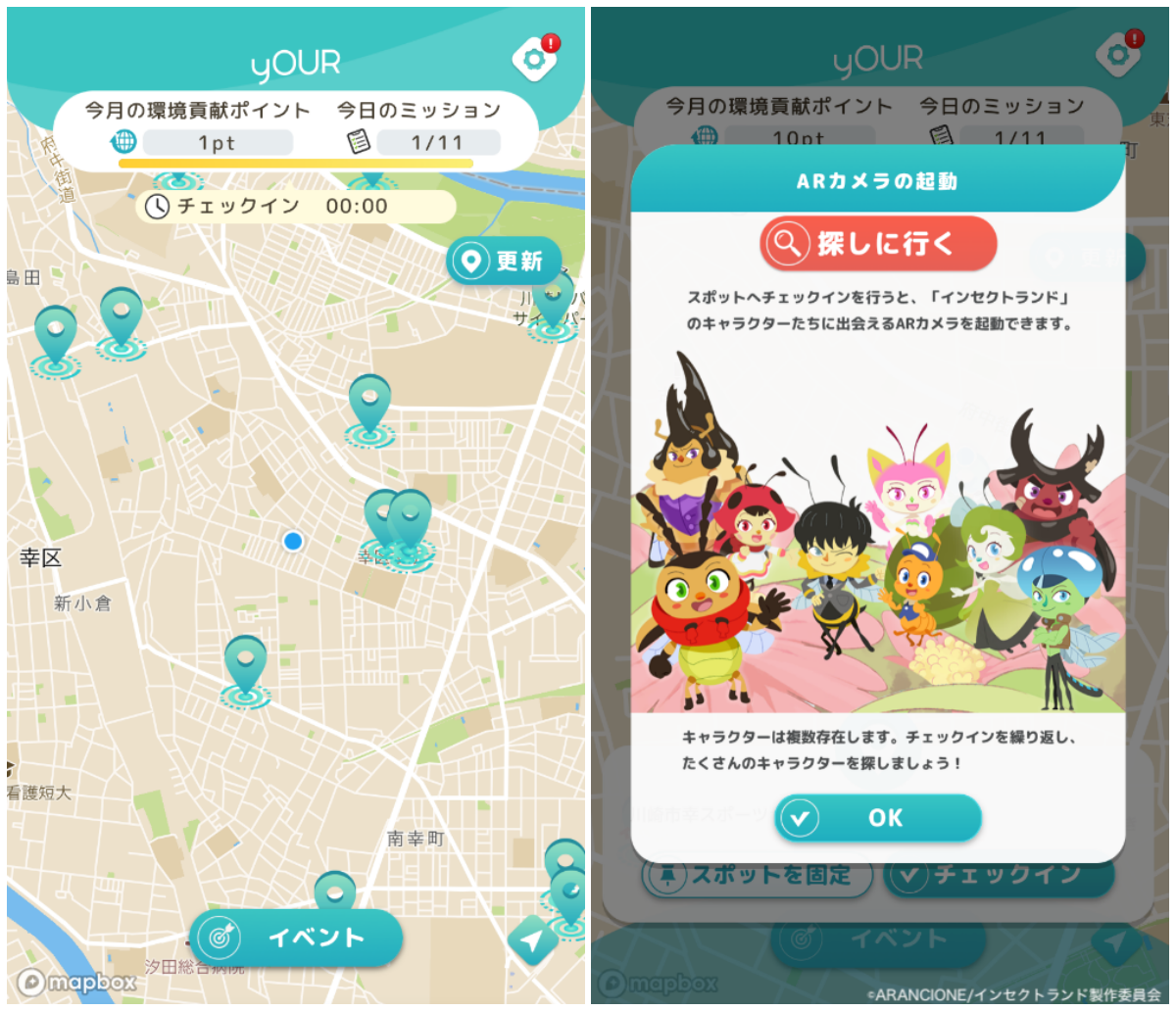 夏季実証では、アプリを通じて、指定された時間に特定のスポットでチェックインすることで、 PayPay ポイントが獲得できるほか、香川照之プロデュース自然教育アニメ「インセクトランド」のキャラクターが登場するARコンテンツの体験ができます。
