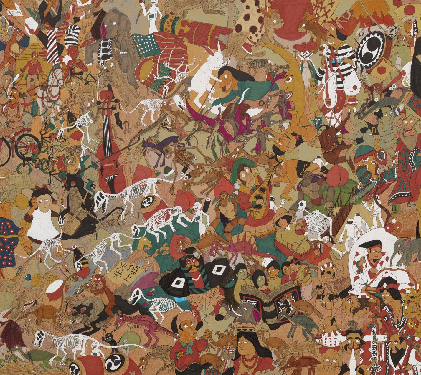 ハサミで紙を櫛状に細かく切ってゆくことでふわふわとした繊細な立体物を生み出す藤岡祐機。独自のカリグラフィと、架空の映画の絵コンテのようなコマ割りの絵を描き出す上土橋勇樹。ユーモラスな表情を浮かべる不思議な粘土の生き物のようなオブジェをつくる澤田真一。古久保憲満はテレビのニュースやインターネットで情報を集め、大きな画用紙にどこにもない空想の都市を緻密に描き出します。大型の作品としては、鵜飼結一朗の作品があります。恐竜の骨や骸骨、動物たちや様々なキャラクターがみっしりと描かれた画面は、妖怪たちが列をなして練り歩く百鬼夜行の現代版のよう。幅82.5㎝の画用紙に描かれた作品は、右から左に向けてつながるように描かれていて、今回は14 メートルに及ぶ長大な絵巻として展示します。