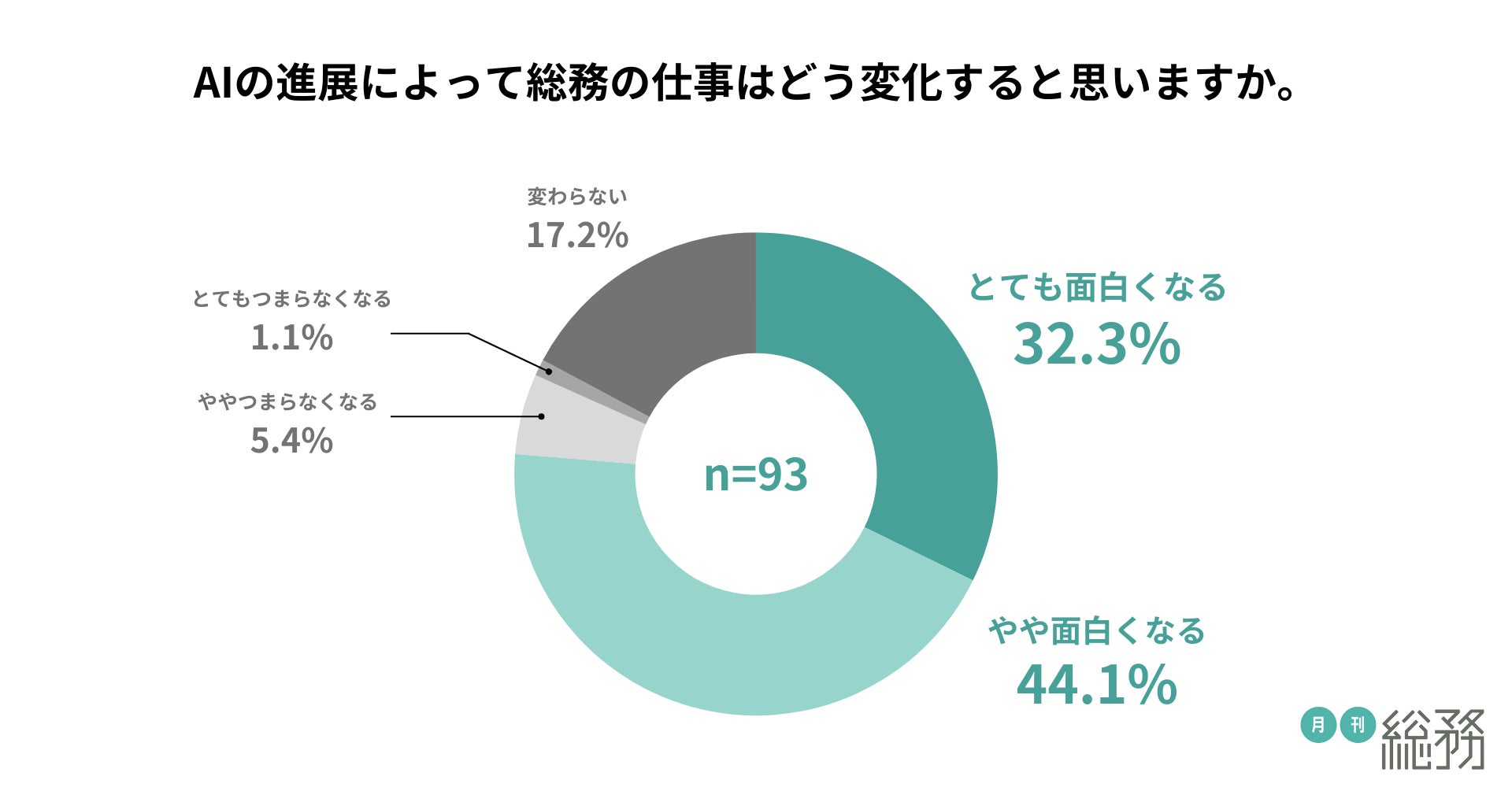 AIの進展によって総務の仕事はどう変化すると思うか尋ねたところ、「とてもおもしろくなる」と「ややおもしろくなる」が合わせて76.4%と、約8割がAIの進展をポジティブに捉えていることがわかりました(n=93)。