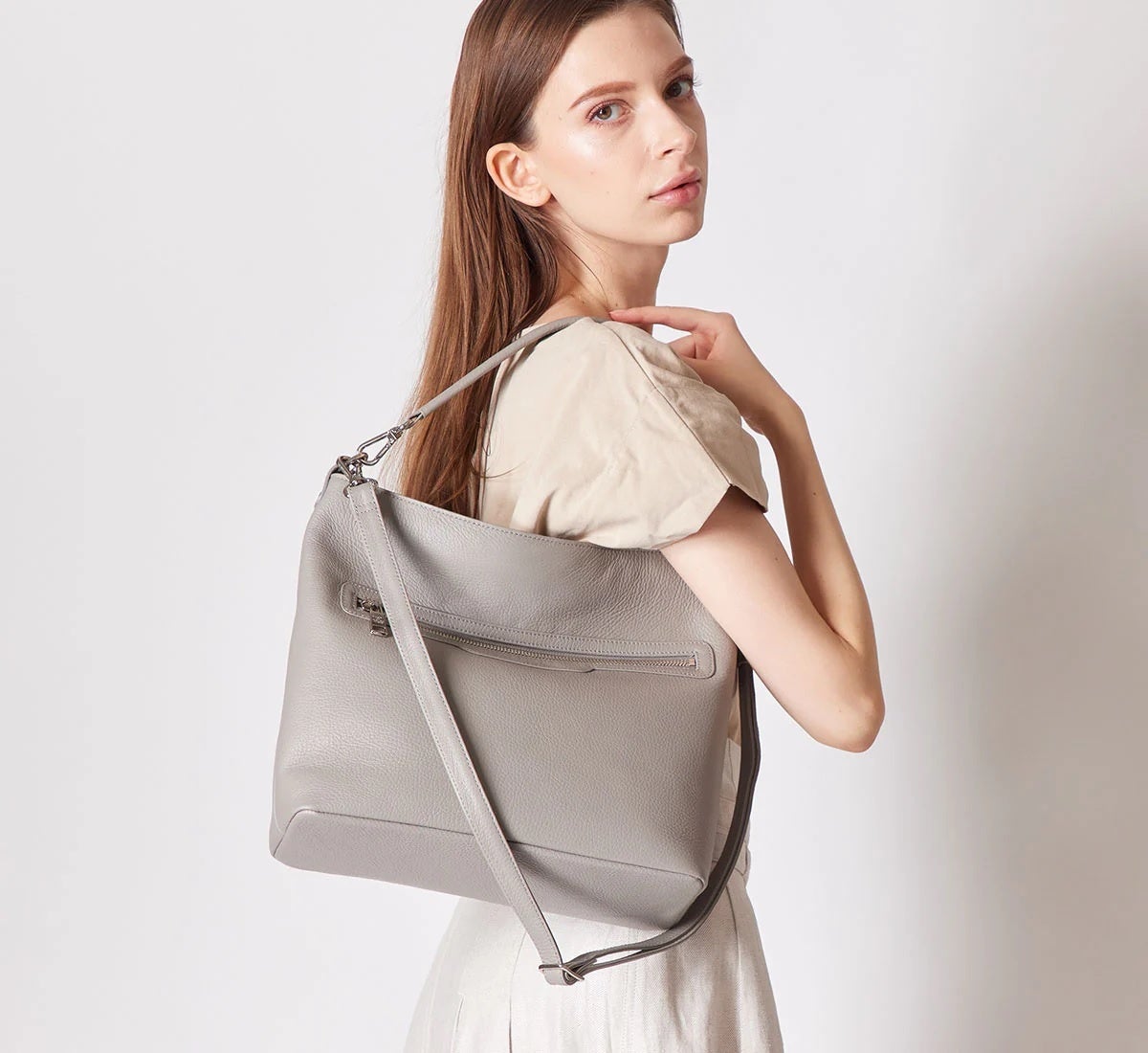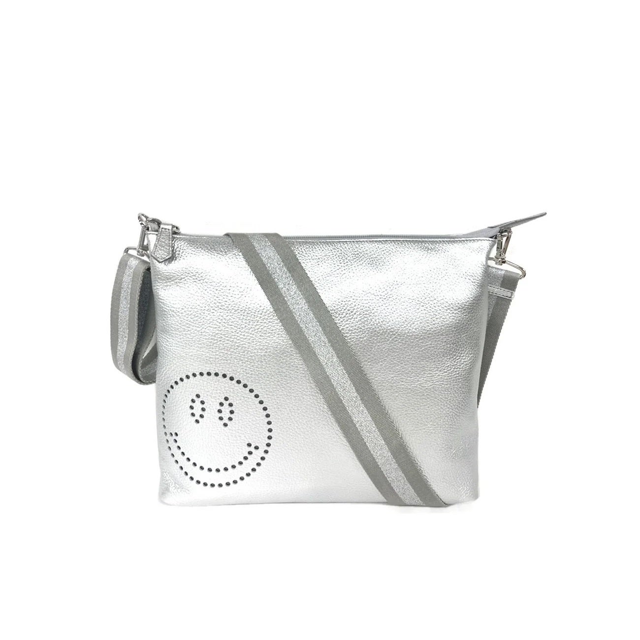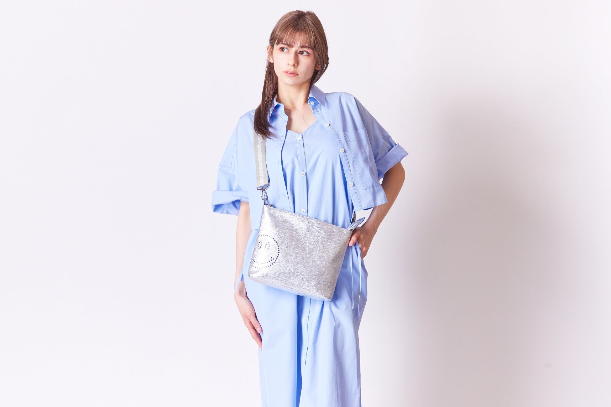派手になり過ぎず上品なシルバーの輝きが美しいバッグは、雨に強いクロムなめしのレザーを使用。重さ約 380g と軽く柔らかい革のため、肩への負担が少なく、しなやかに体に馴染むのが特徴です。スマイルマークが暗くなりがちな雨の日の気分を明るくしてくれそう。