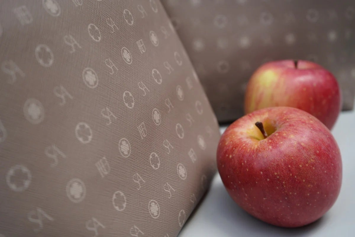 【SALON DE ALFURD (サロンドアルファード)】では、りんご由来の合成皮革を取り扱っています。りんごの皮や芯などの廃棄物を自然乾燥させた粉末を素材に使用しており、本革のような高級感がありながら、非常に軽く、 耐水性があり、多少のひっかき傷にも強く、しわになりにくい特徴があります。