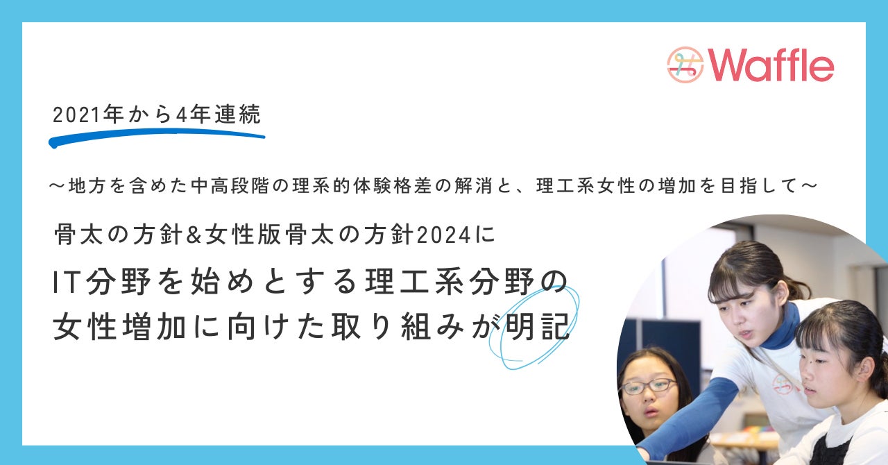 IT分野のジェンダーギャップの解消を目指す特定非営利活動法人Waffleは、2024年6月21日(金)に閣議決定された「経済財政運営と改革の基本方針2024(通称:骨太の方針)」、6月11日(火)に決定された「女性活躍・男女共同参画の重点方針(通称:女性版骨太の方針)」において、Waffleの提言する「IT分野を始めとする理工系分野の女性を増やす取り組み」について明記されたことをお知らせします。