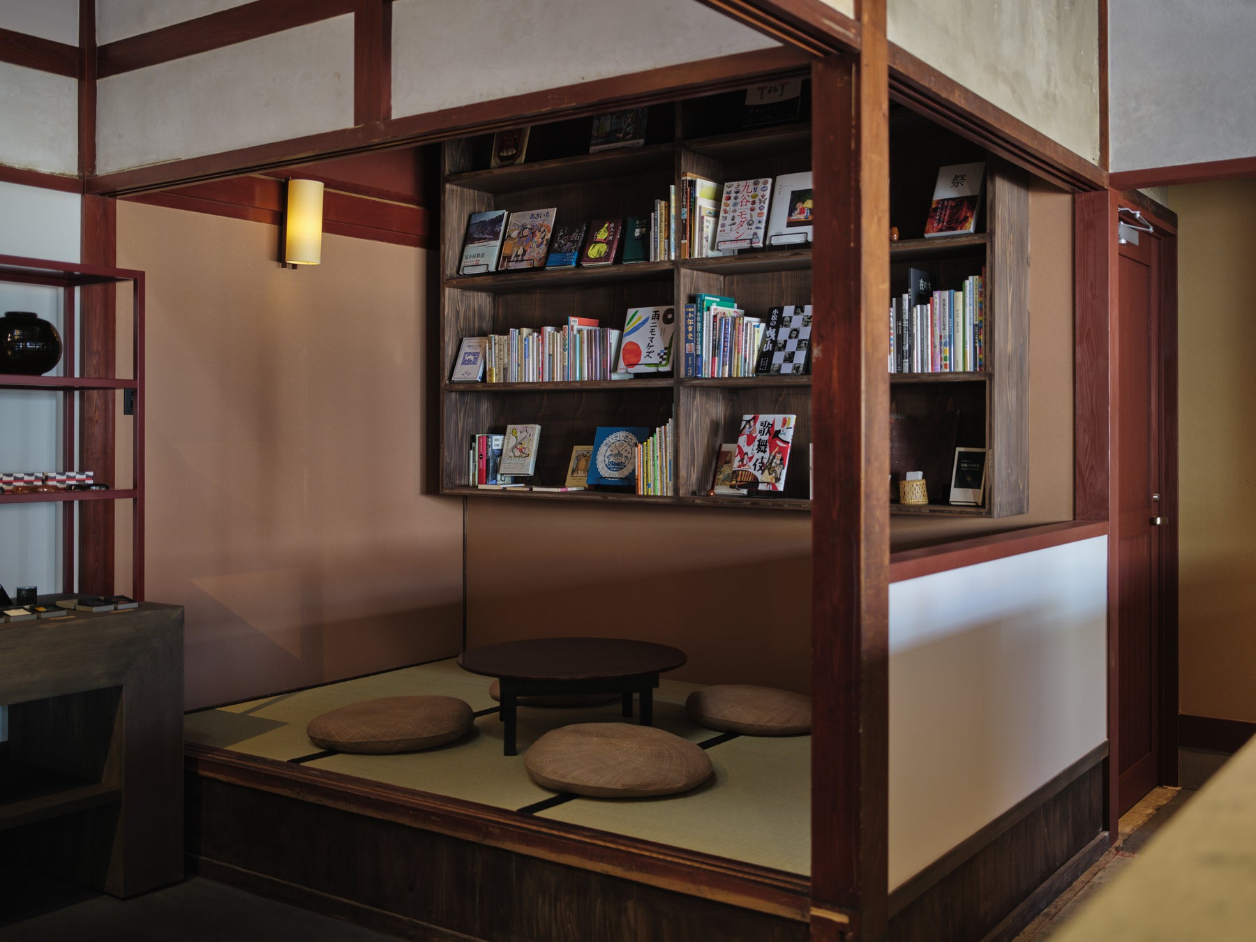 通りに面して大きく開いたカウンターは、ホテルのチェックイン機能とカフェを兼ねた新たなスタイル。カウンターには小松を象徴する石材、滝ヶ原石を用い、地域の風景に溶け込むように設えました。蔵を活かしたカフェラウンジでは、370年続く長保屋茶舗の自家焙煎“棒入り茶”や、小松市民に愛されるコーヒー店、リセッタブルーによる「Komadoブレンド」を提供。さらに、小松・九谷の生活工芸を購入できるショップや、キヅキブックスによる約100冊の選書を揃えたライブラリーも併設。一口の味わいから、一枚の器から、一冊の本から、小松の暮らしに触れる時間となっています。
