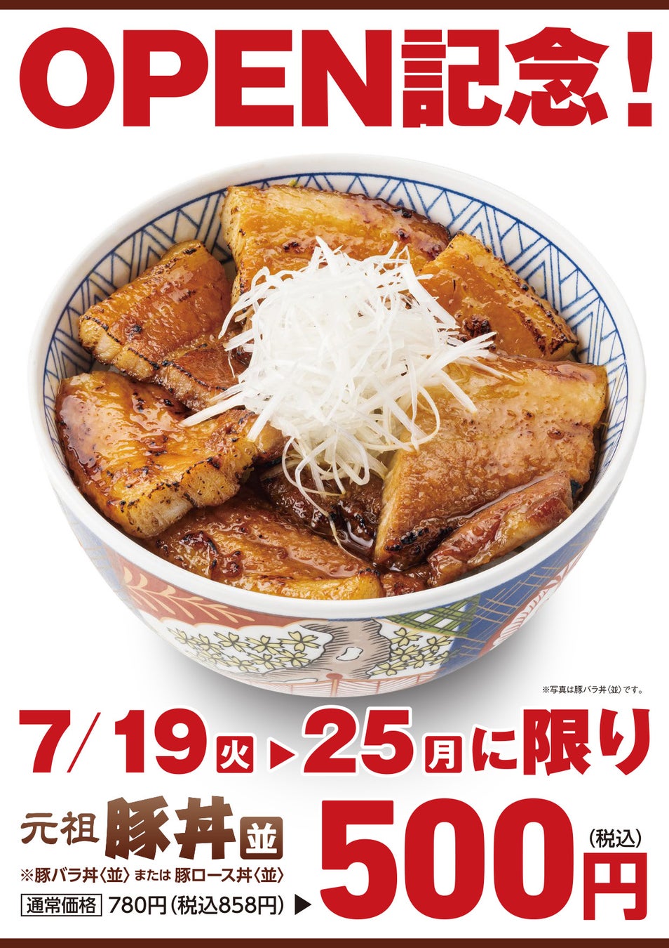 船場センタービル10号館店のオープンを記念して、7/19(火)〜25(月)の期間中、当店自慢の「豚バラ丼〈並〉」または「豚ロース丼〈並〉」を特別価格500円(税込)にて提供いたします。