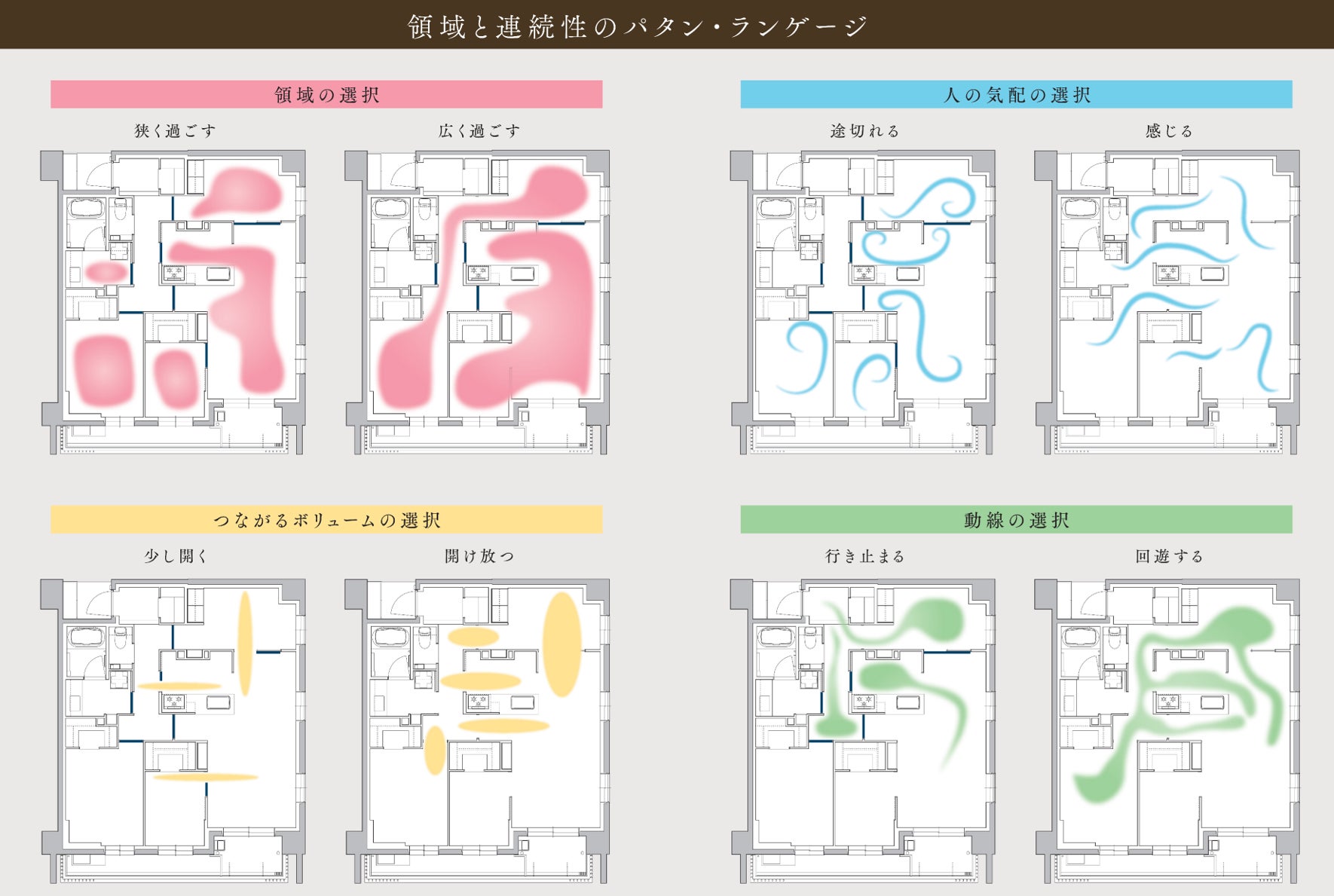従来の寝室やLDKという概念にとらわれず、住まい手が扉の開閉による領域や空間連続性、人との距離感・動線を自発的に選択し、多様な生活現象を生み出せる住戸ユニットを提案しました。