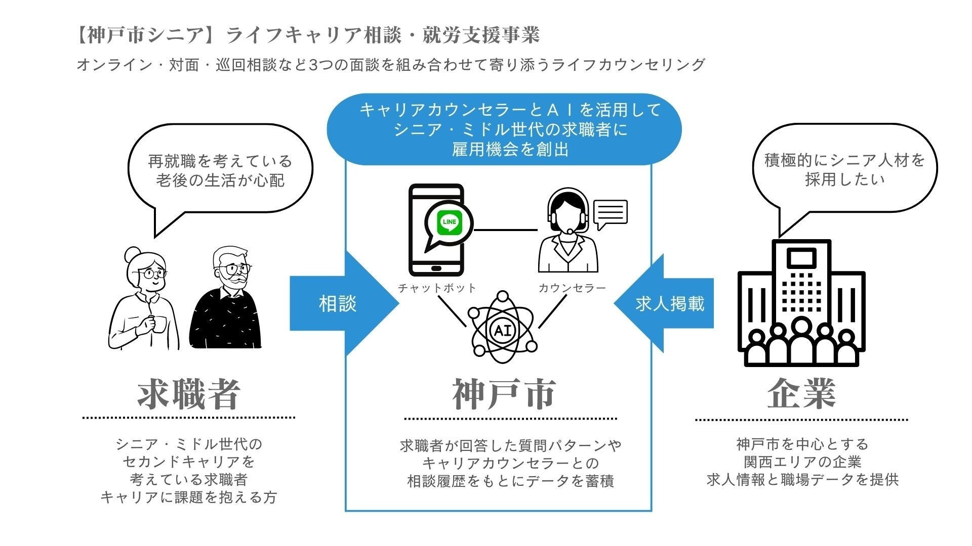 Compassはこの度、神戸市のシニアキャリア相談・就労支援事業の委託事業者として採択されました。本事業では、潜在的な就労意欲のある高齢者に対して、無料で利用できるLINEを通じて国家資格を持つキャリアカウンセラーによるオンライン相談、AIとキャリアカウンセラーを組み合わせた精度の高いマッチング、セカンドキャリアに必要なセミナー情報などを提供します。