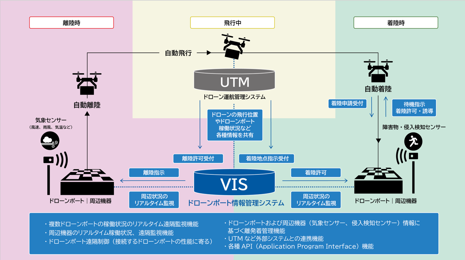 今回、この取り組みの一環として、災害時を想定したドローンと自動配送ロボットによる支援物資輸送の実証実験を通して、ブルーイノベーションが構築したドローンポート情報管理システム(VIS)により、それぞれのモビリティやドローンポート、第三者侵入検知や環境センサー等の周辺機器をシステム連携し、その有用性の検証を行いました。