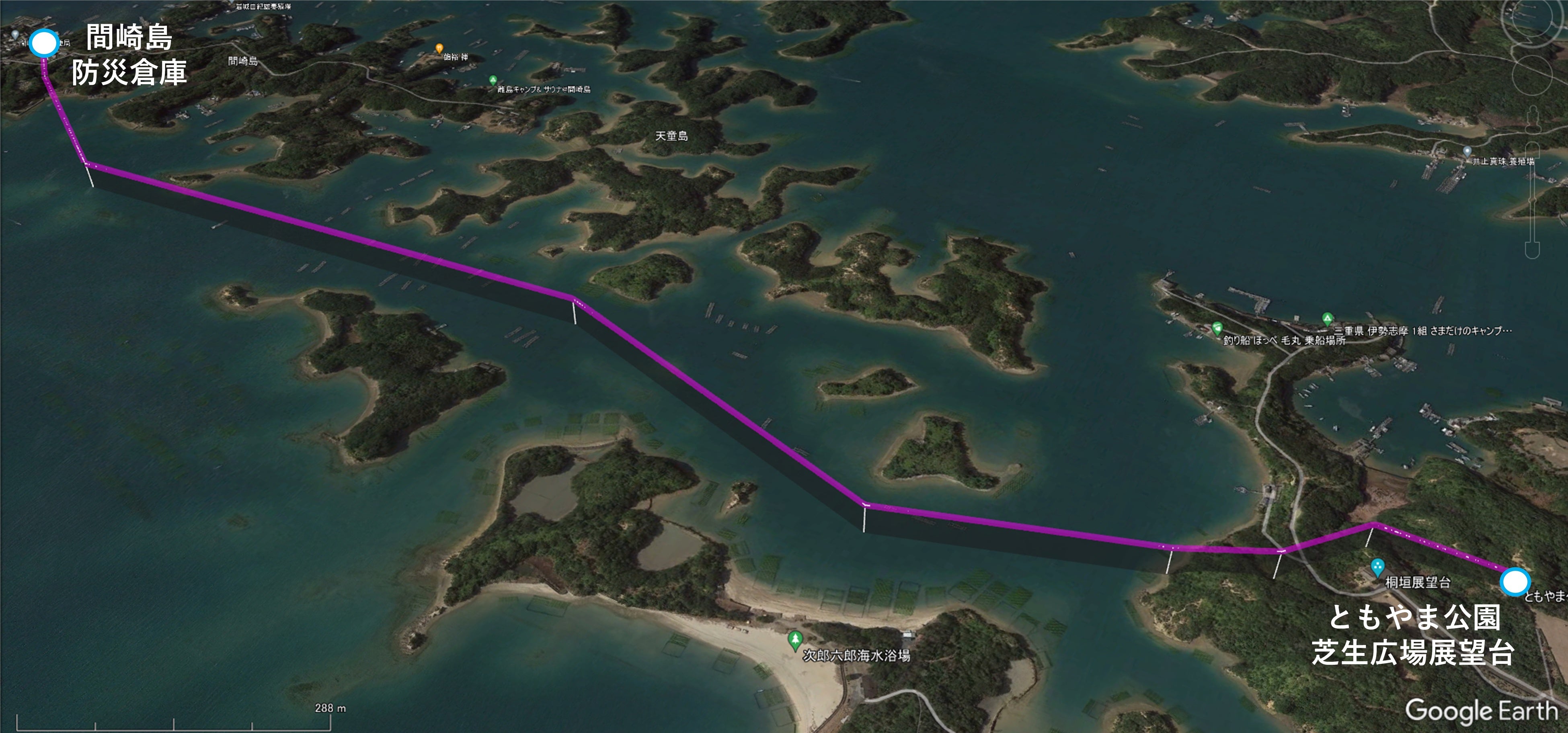 [配送ルート]ともやま公園芝生広場展望台離陸後、海上飛行を行って間崎島に着陸(飛行距離:約2.7㎞)。着陸後、地上配送ロボットにより荷物を配送。