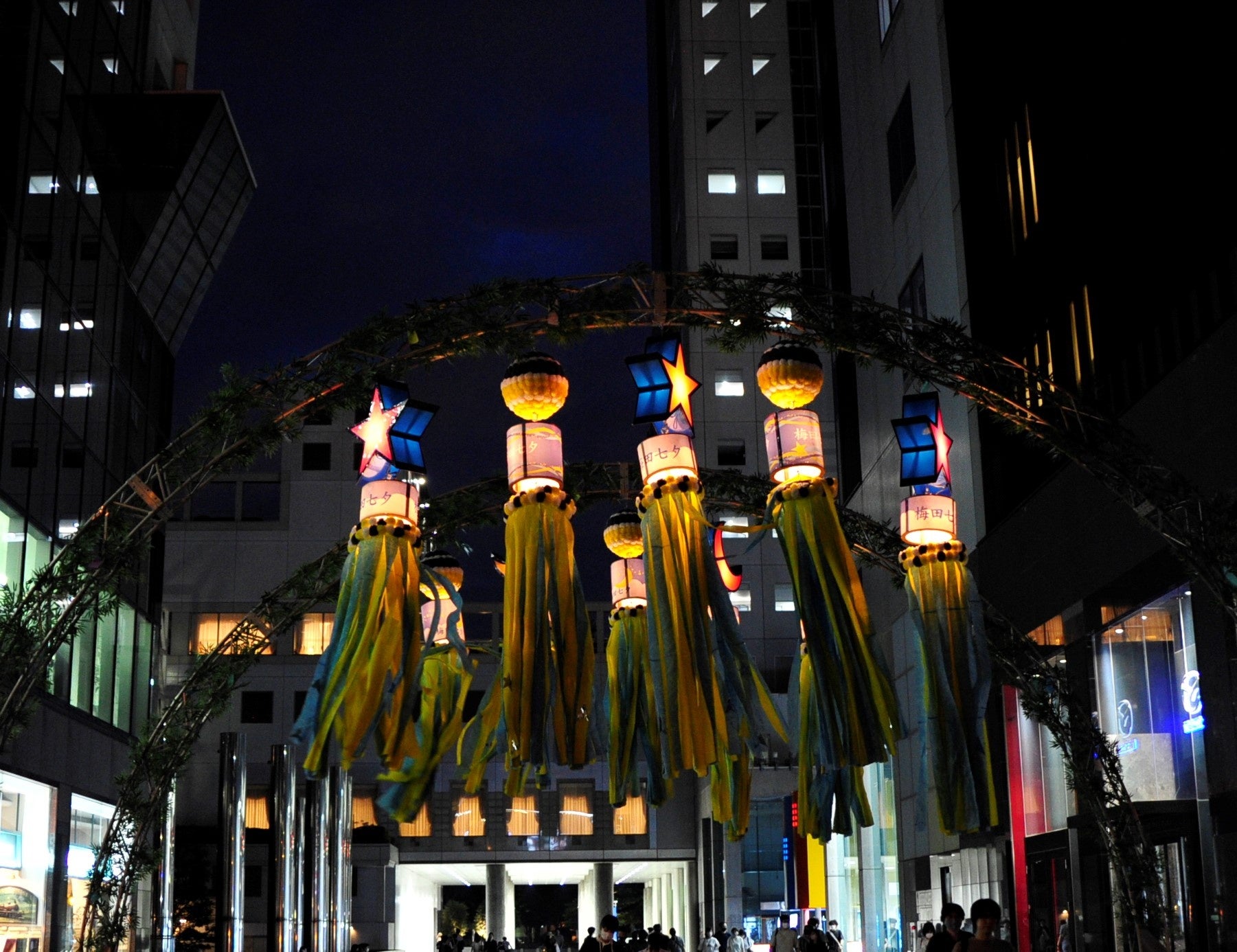 新梅田シティ入口の巨大アーチには吹き流しと呼ばれる七夕飾りが目を引くほか、