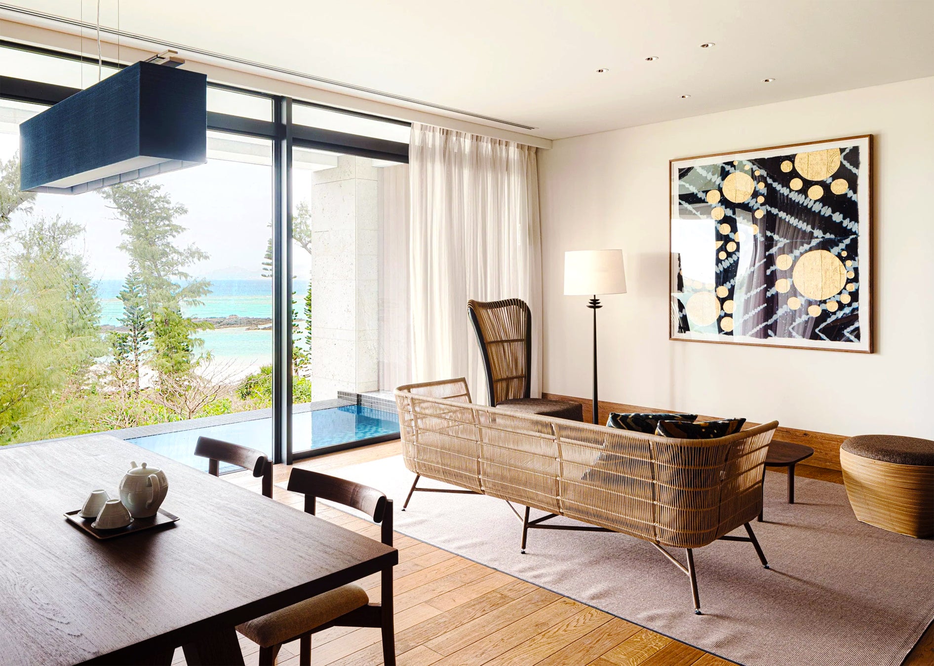 目の前に広がるのは手つかずの自然が残された熱田ビーチ。プール付きのスイートルーム「CHERIE」は南国らしい緑に囲まれ、沖縄らしい風景を大きな窓から一望できます。また、森の小道を抜けると徒歩1分で行ける、UMITOでも指折りの海との近さも人気です。滞在した人しか見られない夕陽や夜の星空の景色を楽しむとともに、琉球王朝時代の邸宅をモダンに昇華させたデザインで、ロマンと温かみも感じます。自然の中で過ごす贅沢を享受できるのは、ここ沖縄の別邸ならでは。