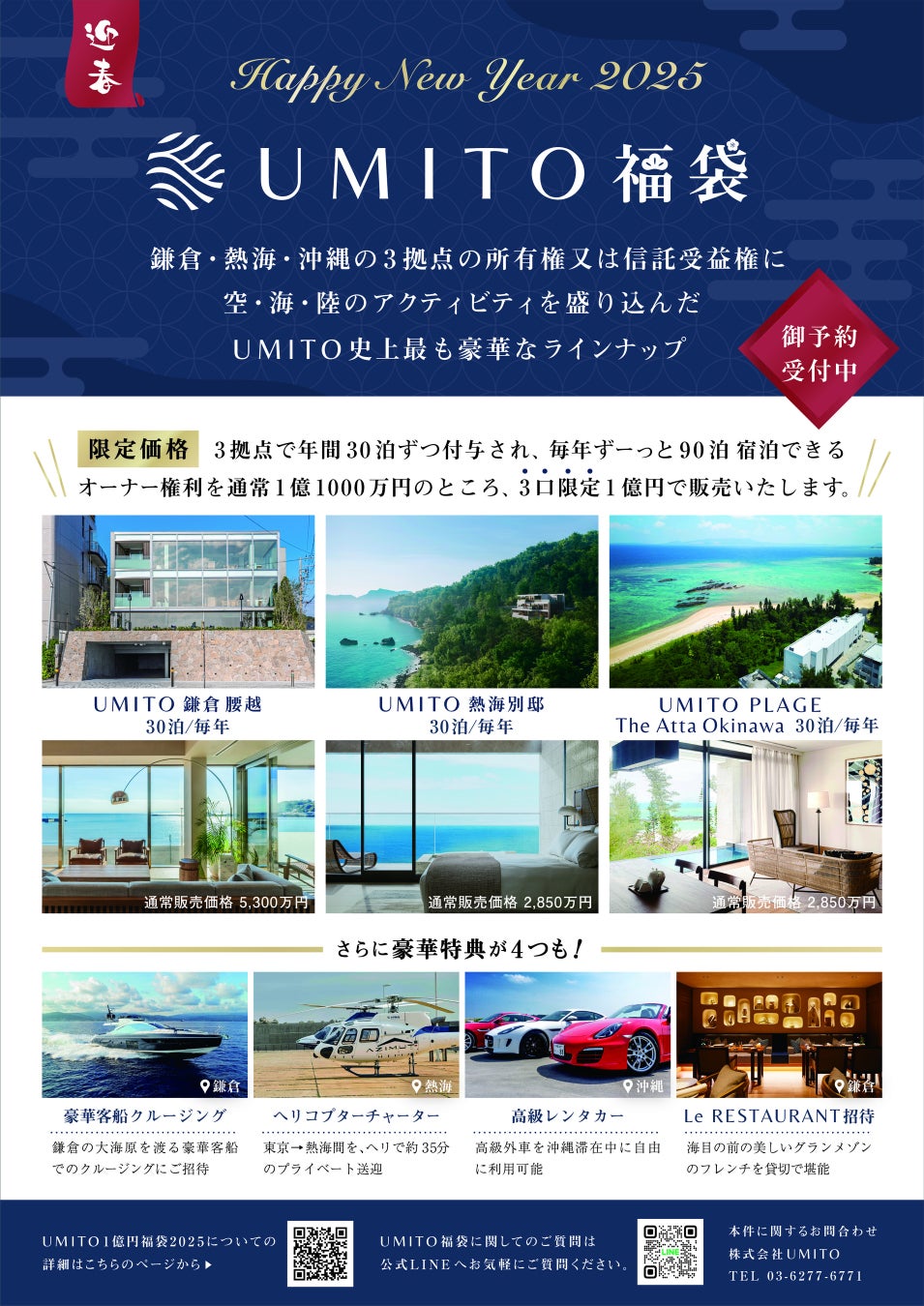 海と共に過ごす別邸「UMITO」をプロデュースする株式会社UMITO(東京都千代田区、代表取締役:堀鉄平)は、UMITOシリーズ初「UMITO 1億円福袋 2025」の3口限定販売を決定いたしました。