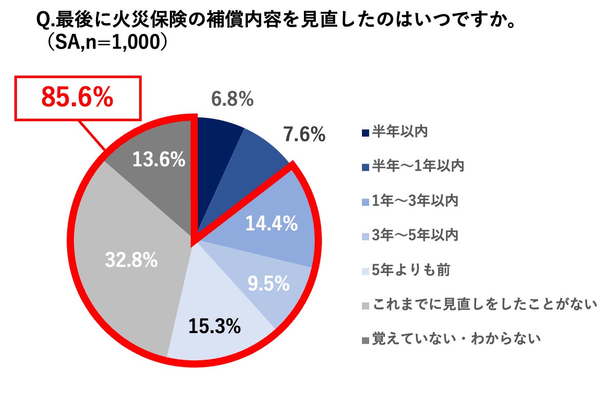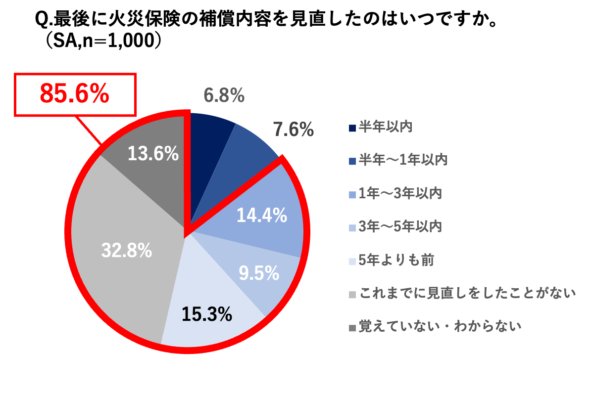 ・ 火災保険の見直し頻度について、「1年以内」に見直した人は14.4%に留まり、加入時のまま、補償内容が見直されていない実態が明らかに。