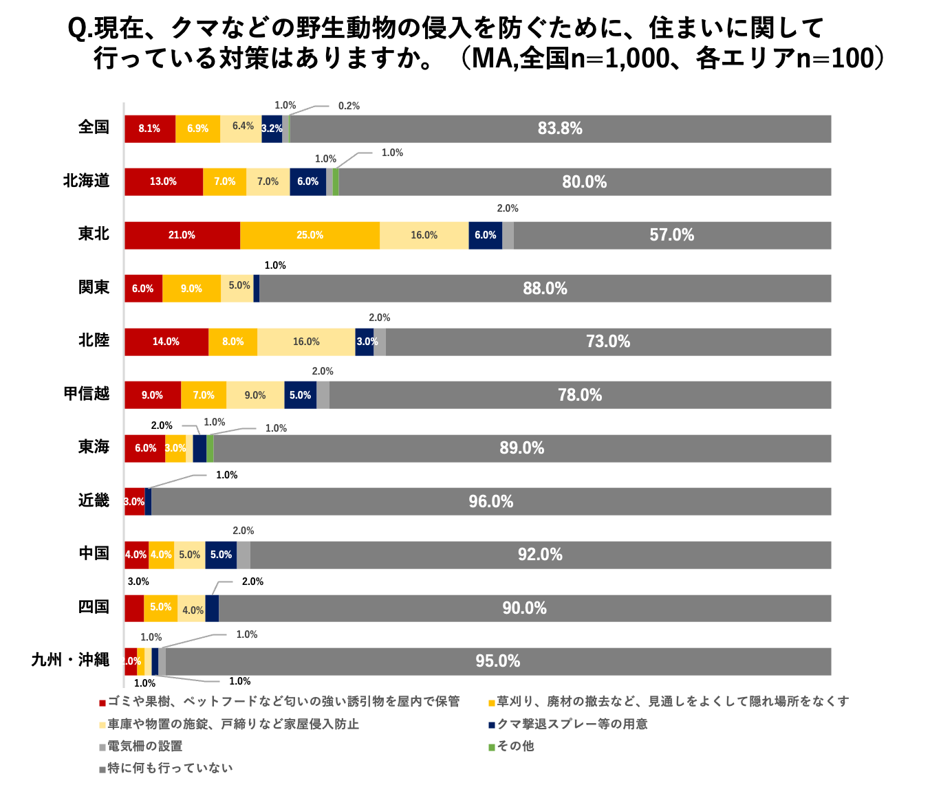 ・クマなど野生動物の侵入を防ぐ住まいの対策について、全体で83.8%が「特に何も行っていない」と回答。
